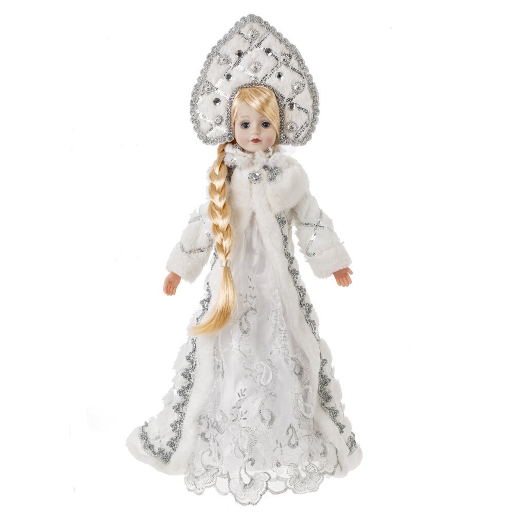 Снегурочка в роскошном белом наряде с меховой отделкой и кокошнике будет прекрасным подарком к Новому году. Ее можно поставить под елку, а так же использовать как милый подарок.