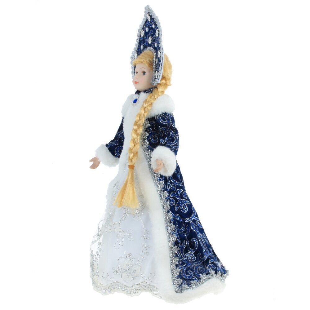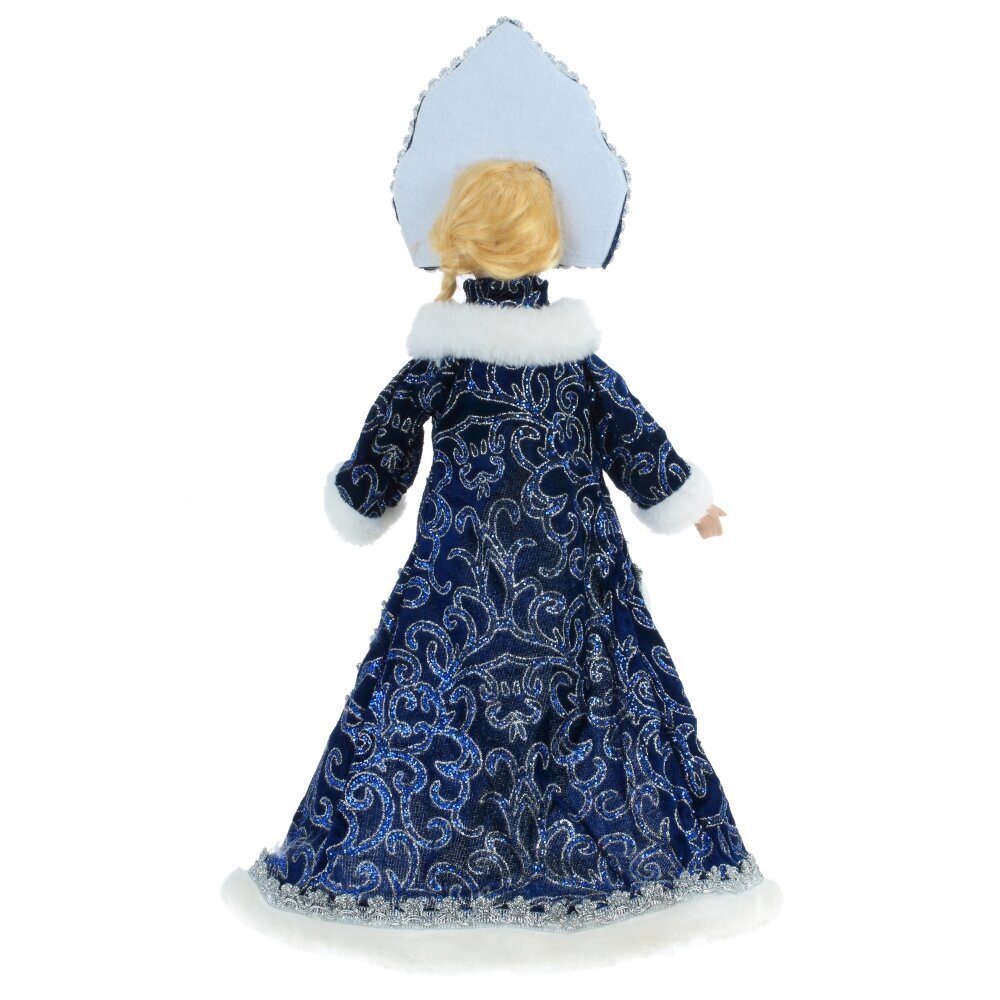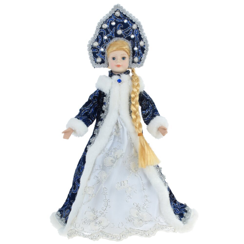 Снегурочка в роскошном синем наряде с меховой отделкой и кокошнике будет прекрасным подарком к Новому году. Ее можно поставить под елку, а так же использовать как милый подарок.