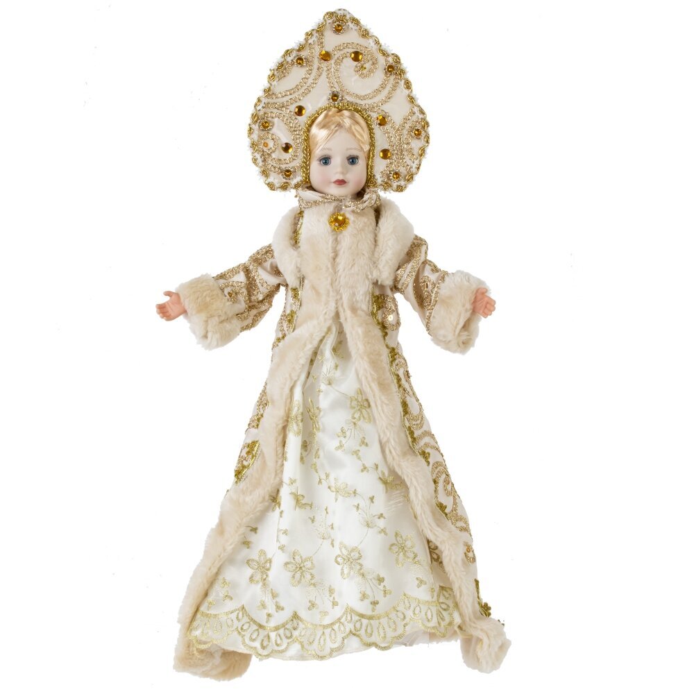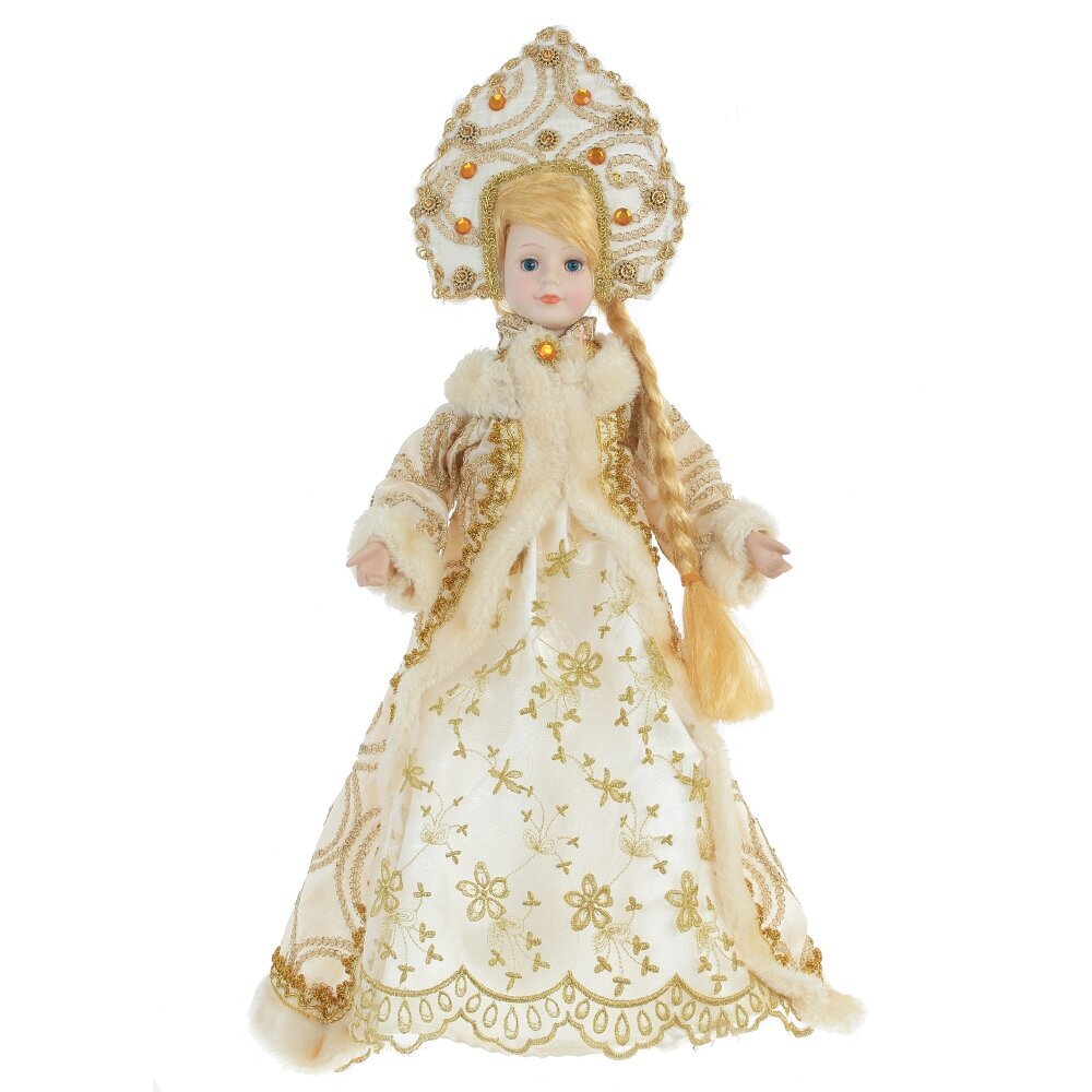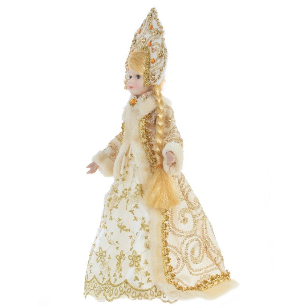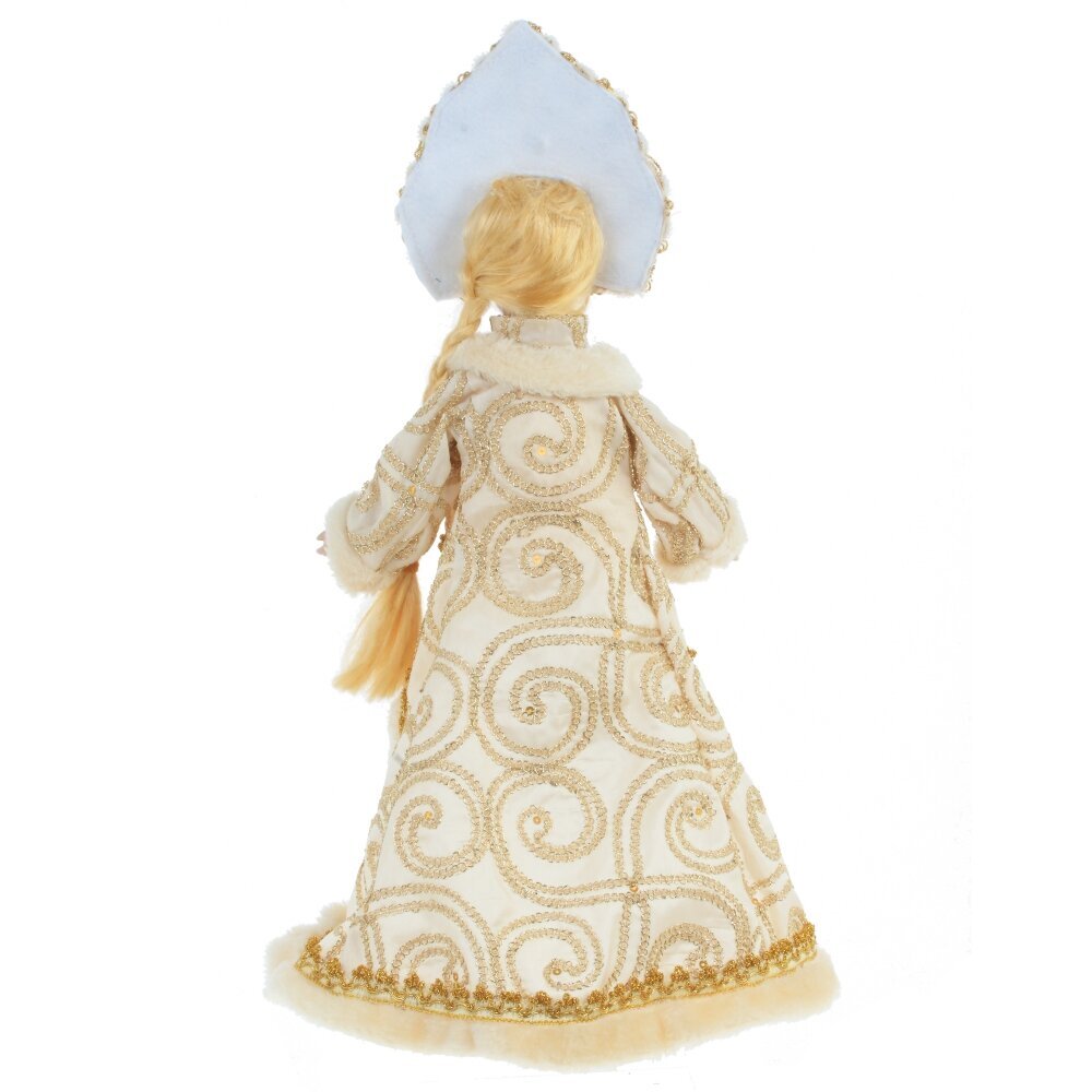Снегурочка в роскошном белом наряде с меховой отделкой и кокошнике будет прекрасным подарком к Новому году. Ее можно поставить под елку, а так же использовать как милый подарок.
