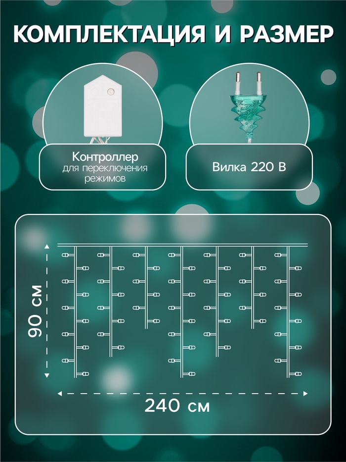 Производитель: Luazon Lighting; Габариты: 21,5 x 10 x 20; Страна: Китай; В боксе: 24 шт; Состав: Металл, пластик; Материалы: металл, пластик; Фасовка: по 1 шт; Индивидуальная упаковка: Цветная картонная коробка; Сертификат: ЕАС; Цвет нити гирлянды: Прозрачный; Цвет свечения: Мульти; Применение: Внутреннее; Вид лампы: Светодиодная; Материал нити: ПВХ; Тип подключения: С контроллером; Вид гирлянды: Бахрома; Количество ламп: 138; Серия: DECOR; Режим работы: Задаётся контроллером; Наличие блока питания: Нет; Размер, м: 2.4 х 0.9; Насадки: Да; Вид насадки: Ёлочки; Ширина, м: 2,4; Высота, м: 0,9; Количество режимов: 8; Гарантийный срок, мес.: 12; Тематика праздника: Новый год; Степень защиты: IP20; Материал насадок: Пластик; Температурный режим: от -10 до +35 °С; Тип питания: От сети 220 В [Бахрома декоративная светодиодная гирлянда, состоящая из основного горизонтального провода, к которому прикреплены свисающие вниз световые нити разной длины. Такой дизайн отлично подходит в качестве декора входных зон, для украшения окон, фасадов зданий, дверных проёмов и стен.122][IP 20/ устройство защищено от твердых объектов диаметром больше 12,5 мм и не защищено от проникновения воды.122][Цвет свечения: мульти, белый, тёплый белый, синий, фиолетовый, желтый, зеленый, красный. Цвет нити: черный, белый, прозрачный122][Раскрутите нити гирлянды. Гирлянда поставляется в скрученном виде. Для достижения заявленного размера изделия, провода необходимо раскрутить122]Комплектация * гирлянда; * упаковка.