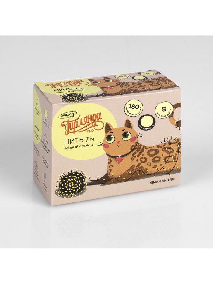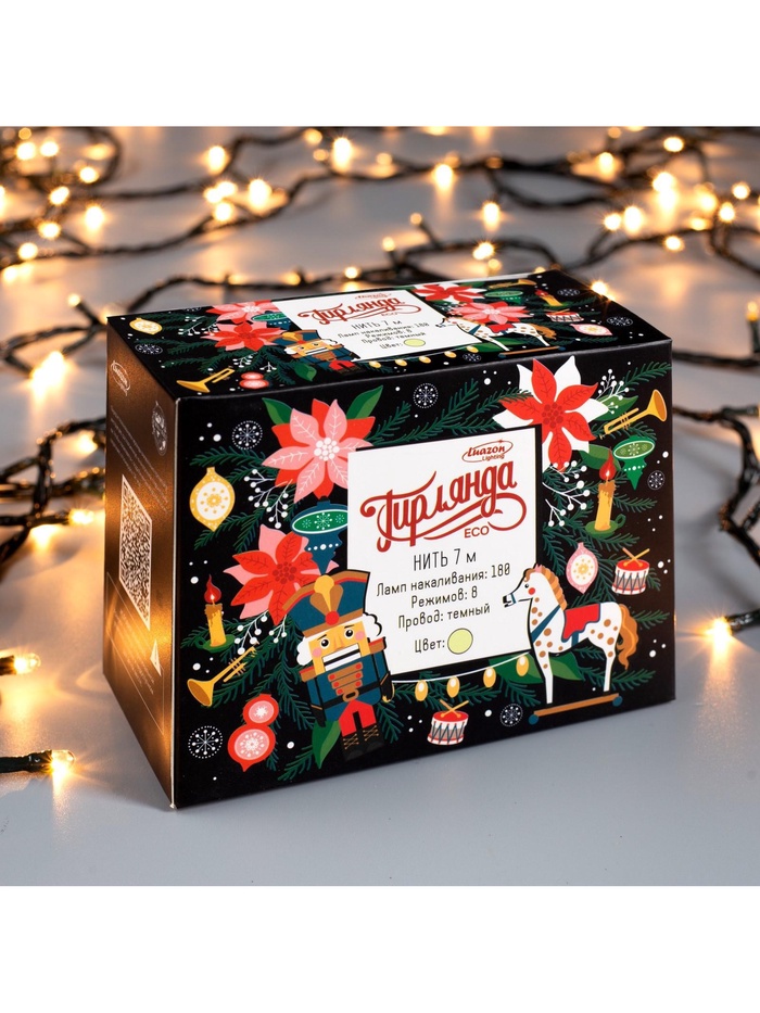 Производитель: Luazon Lighting; Габариты: 11 x 5,5 x 8,5; Цвет свечения: Тёплый белый; Страна: Китай; В боксе: 80 шт; Состав: Металл, пластик; Материалы: металл, пластик; Фасовка: по 1 шт; Индивидуальная упаковка: Цветная картонная коробка; Сертификат: ЕАС; Цвет нити гирлянды: Тёмный; Применение: Внутреннее; Вид лампы: Накаливания; Материал нити: ПВХ; Тип подключения: С контроллером; Вид гирлянды: Гирлянда-нить; Количество ламп: 180; Серия: ECO; Режим работы: Задаётся контроллером; Наличие блока питания: Нет; Насадки: Нет; Вид насадки: Без насадок; Длина, м: 7; Количество режимов: 8; Тематика праздника: Новый год; Степень защиты: IP20; Температурный режим: от -10 до +35 °С; Тип питания: От сети 220 В