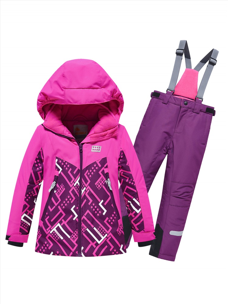 Детский зимний костюм включает в себя куртку прямого кроя с комбинированным дизайном и однотонные горнолыжные брюки.