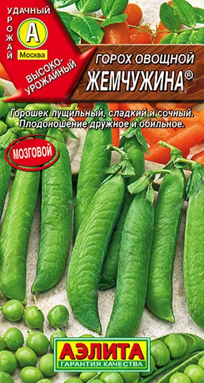 Среднеранний, лущильный сорт. От всходов до технической спелости 60-65 дней. Растения высотой 70 см, формируют в узле по два боба. Горошек мозговой, сладкий и сочный. Витаминов, сахаров и белка содержит больше, чем гладкозерные сорта. Сорт отличается высокой урожайностью зеленого горошка (0,9-1,5 кг/м2) и дружным созреванием бобов. В свежем виде это традиционное сезонное лакомство. Горошек идеален для заготовок и консервирования – в замороженном виде полностью сохраняет вкусовые и питательные качества.
