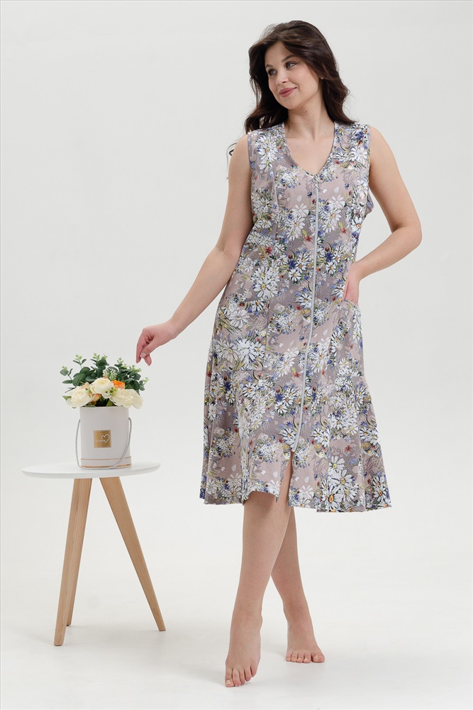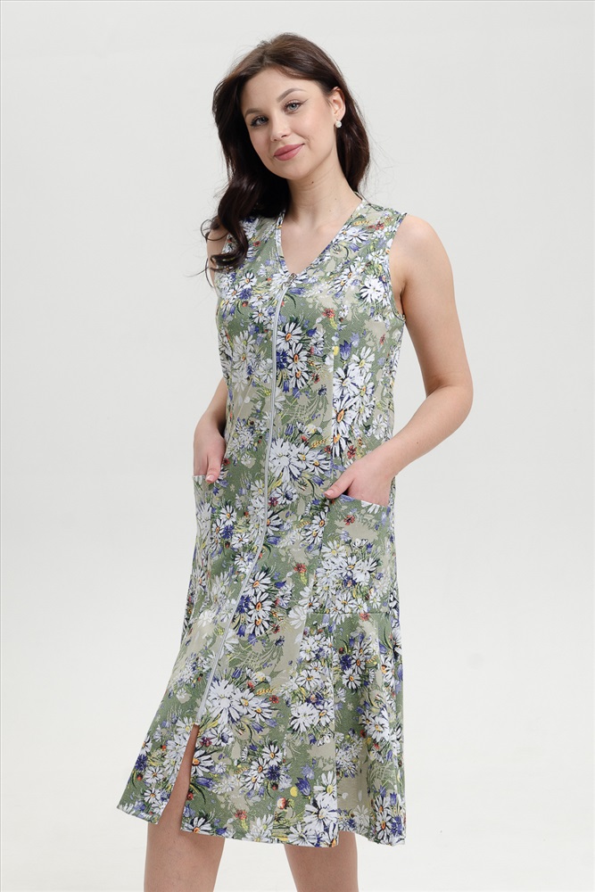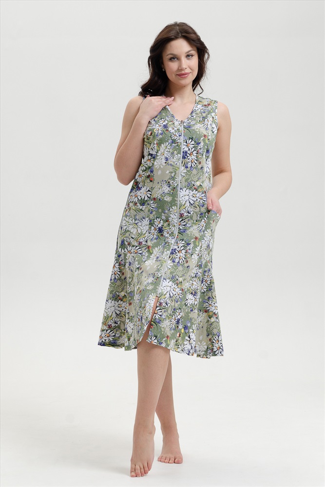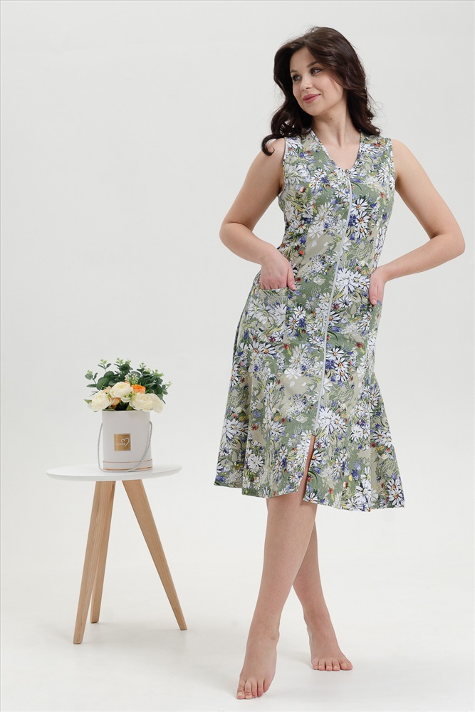 Состав: 100% хлопок Модель: Халат 29 Тип товара: халат Материал: кулирка | кулирка Бренд: Rozkova KV Длина: средняя длина Карман: накладные Назначение: для дачи | для дома Отделка: с карманами Рисунок: цветы Рукав: без рукава Сезонность: лето | осень | весна | зима Силуэт: полуприлегающий Стиль: домашний Воротник: без воротника Застежка: молния Халат женский нежной расцветки с ромашками выполнен из кулирки 100% хлопок. Халат укороченный, без рукава, на молнии, под карманом подрез, который придает изделию расклешение. Халат очень комфортный, отлично подойдет для дома и отдыха. Таблица размеров и веса