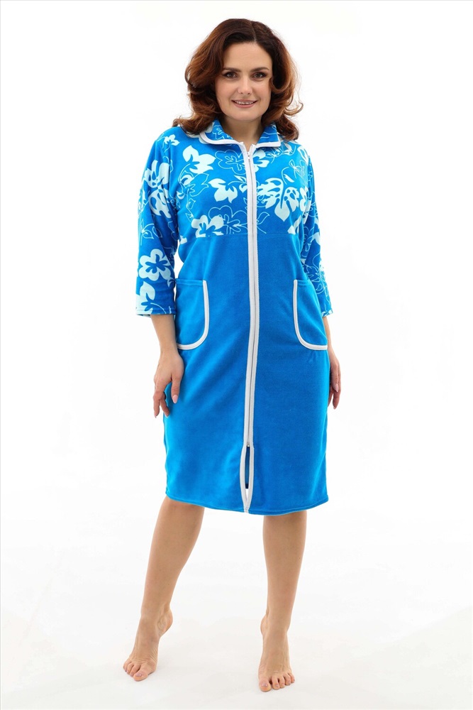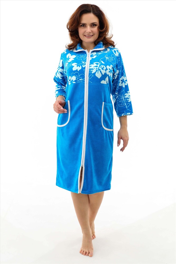 Халат женский на молнии, воротник круглый, в боковых швах два полупояса, рукав длиной до локтя. В наличии есть большие размеры. Ткань велюр.