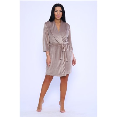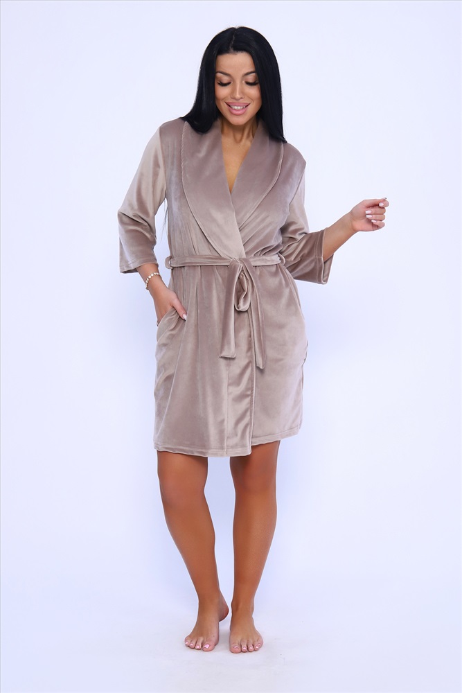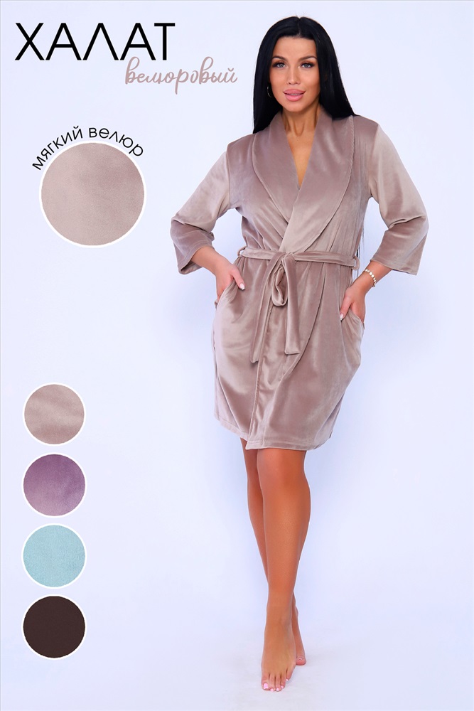 Женственный халатик на запах с поясом полуприлегающего силуэта длиной чуть выше колена с воротником - шалькой. Выполнен из нежной бархатной ткани приятных оттенков - велюра, которая очень приятна к телу, в меру теплая и практически не мнется, что делает ношение вещи удобнее. Халат оснащен внутренним поясом. По краю борта декоративная отстрочка шириной 0,5 см. Рукав втачной длиной 3/4. Укороченная длина рукава удобна для ношения на кухне. Два кармана с фигурным входом расположены в боковых швах. На уровне талии две петли для пояса. Низ изделия и рукава подогнуты на плоскошовной машине, длина пояса 170 см. Халат на запах - незаменимая вещь в гардеробе каждой женщины, комфортна в ношении и может быть прекрасным подарком для любимых.