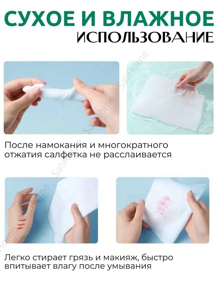 Сухие тканевые салфетки универсальны для любых задач - от косметических процедур, таких как маникюр и педикюр, парикмахерских процедур, массажа, эпиляции и депиляции, косметолога, до уборки дома. Полотенчики представлены в удобной упаковке, которую легко взять с собой на отдых и в дорогу.