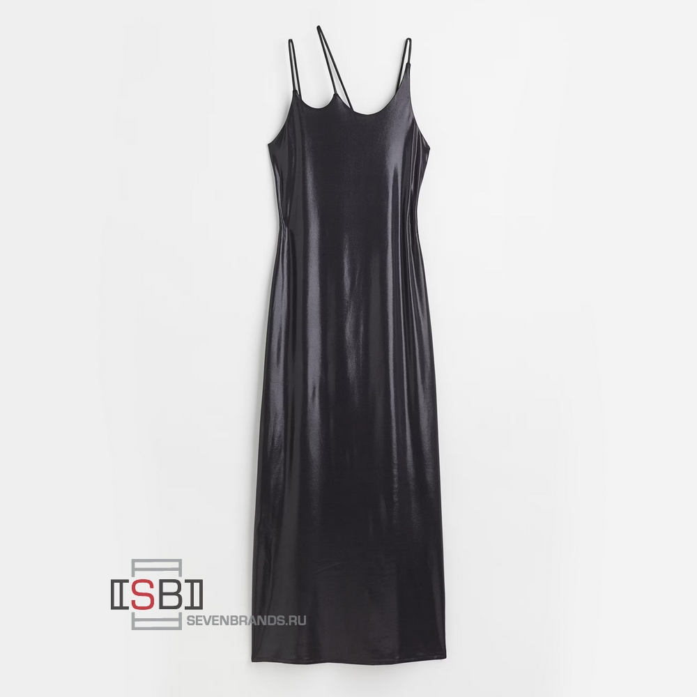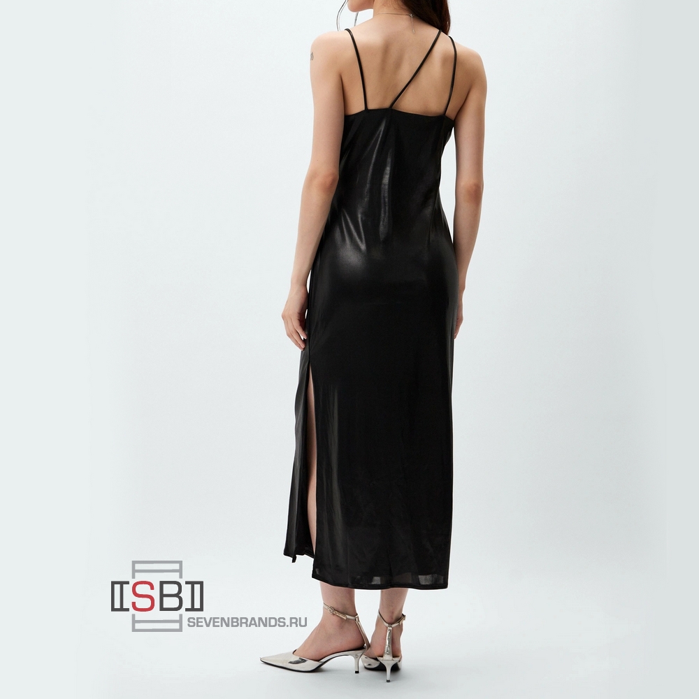 Платье без рукавов, облегающее, длиной до щиколотки, из трикотажа, с тремя тонкими бретельками, создающими округлую форму у горловины, и высоким разрезом сбоку по подолу. Полностью на подкладке.