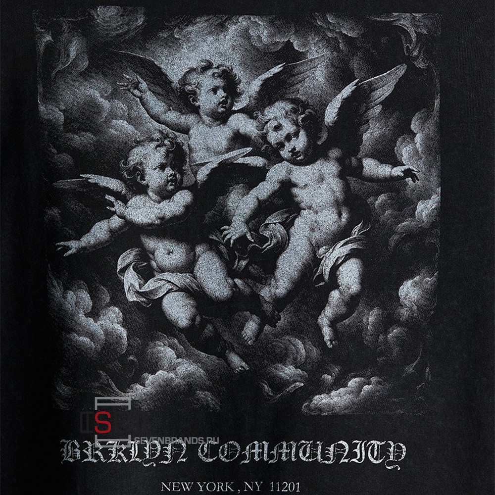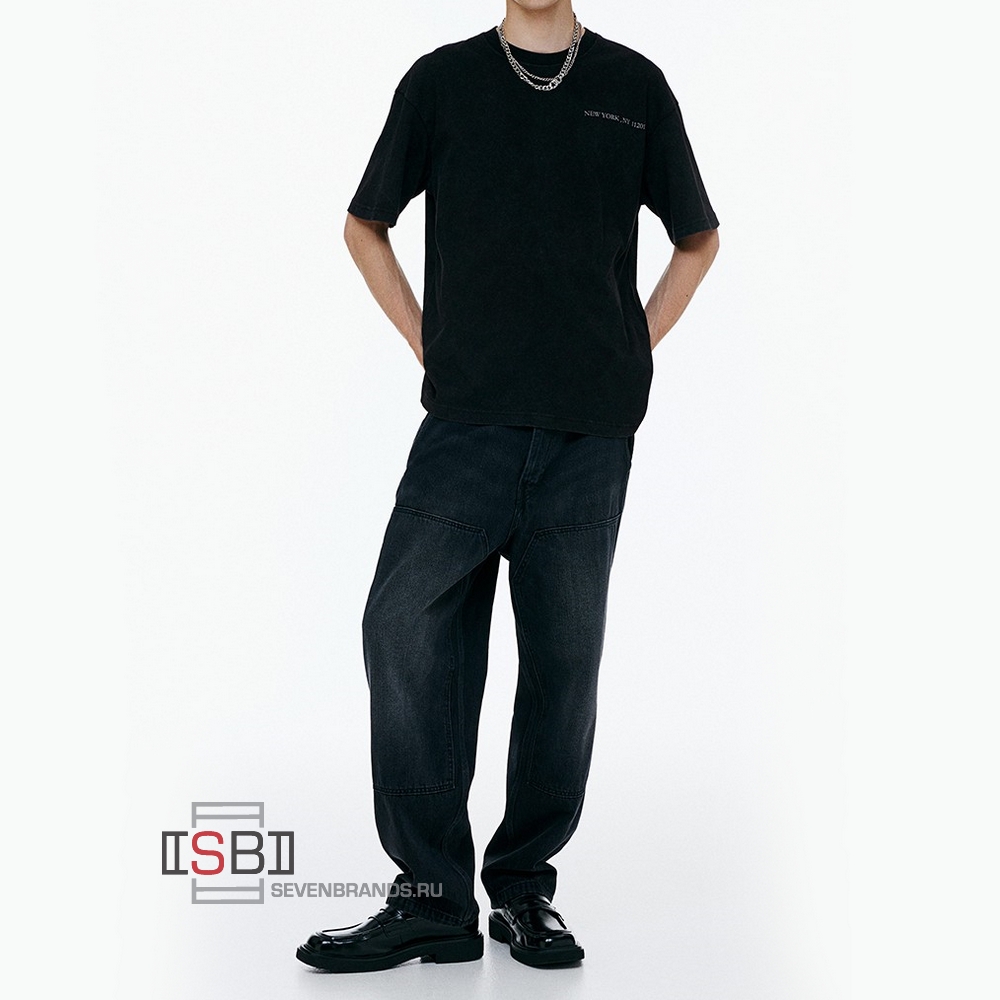 Футболка из хлопкового трикотажа средней плотности с принтом, винтажный вид и мягкость на ощупь. Круглый вырез горловины, отделанной резинкой, спущенная линия плеча и прямой подол.