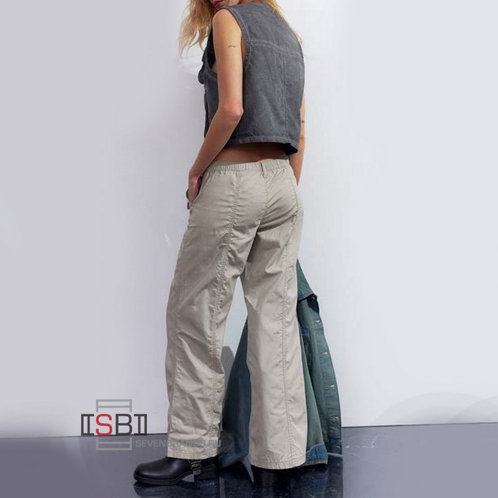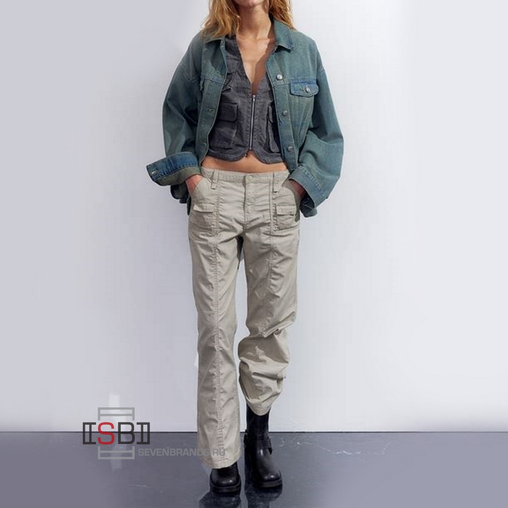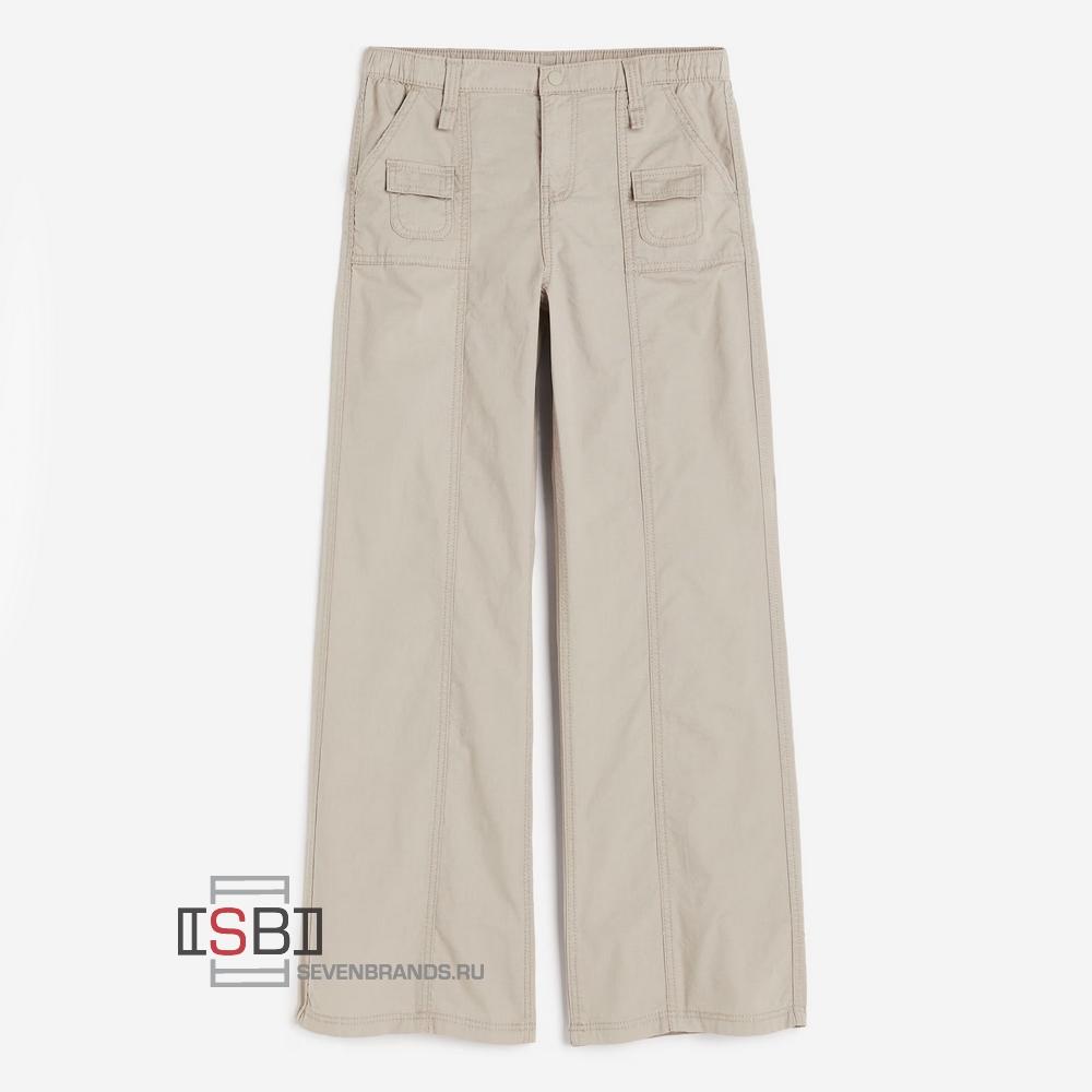 Брюки-карго из хлопчатобумажной парусины. Заниженная талия, пояс с обтянутой резинкой по бокам и сзади, застежка на молнию и кнопку. Диагональные боковые карманы, каждый из которых имеет дополнительный маленький карман с клапаном спереди. Прямые брючины с застроченными стрелками спереди и сзади.