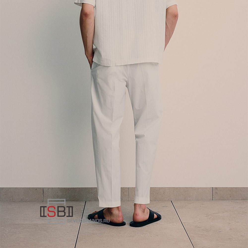 Джоггеры длиной до щиколотки из хлопковой ткани с резинкой, кулиской на талии, застёжкой на молнию и пуговицу. Боковые карманы и прорезные карманы сзади на пуговице. Штаны со стрелками спереди и сзади.