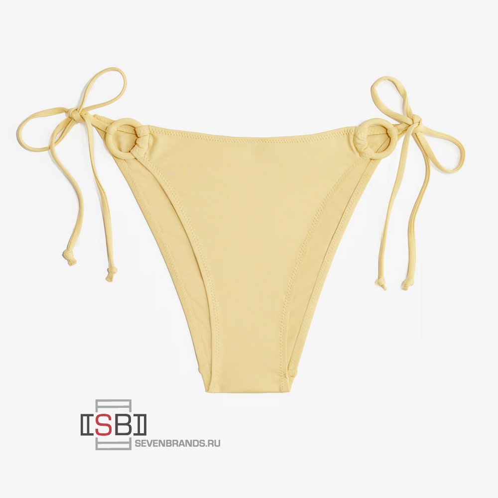 Плавки бикини на подкладке с декоративными, скрытыми кольцами спереди. Средняя талия, завязки по бокам и вырез сзади.