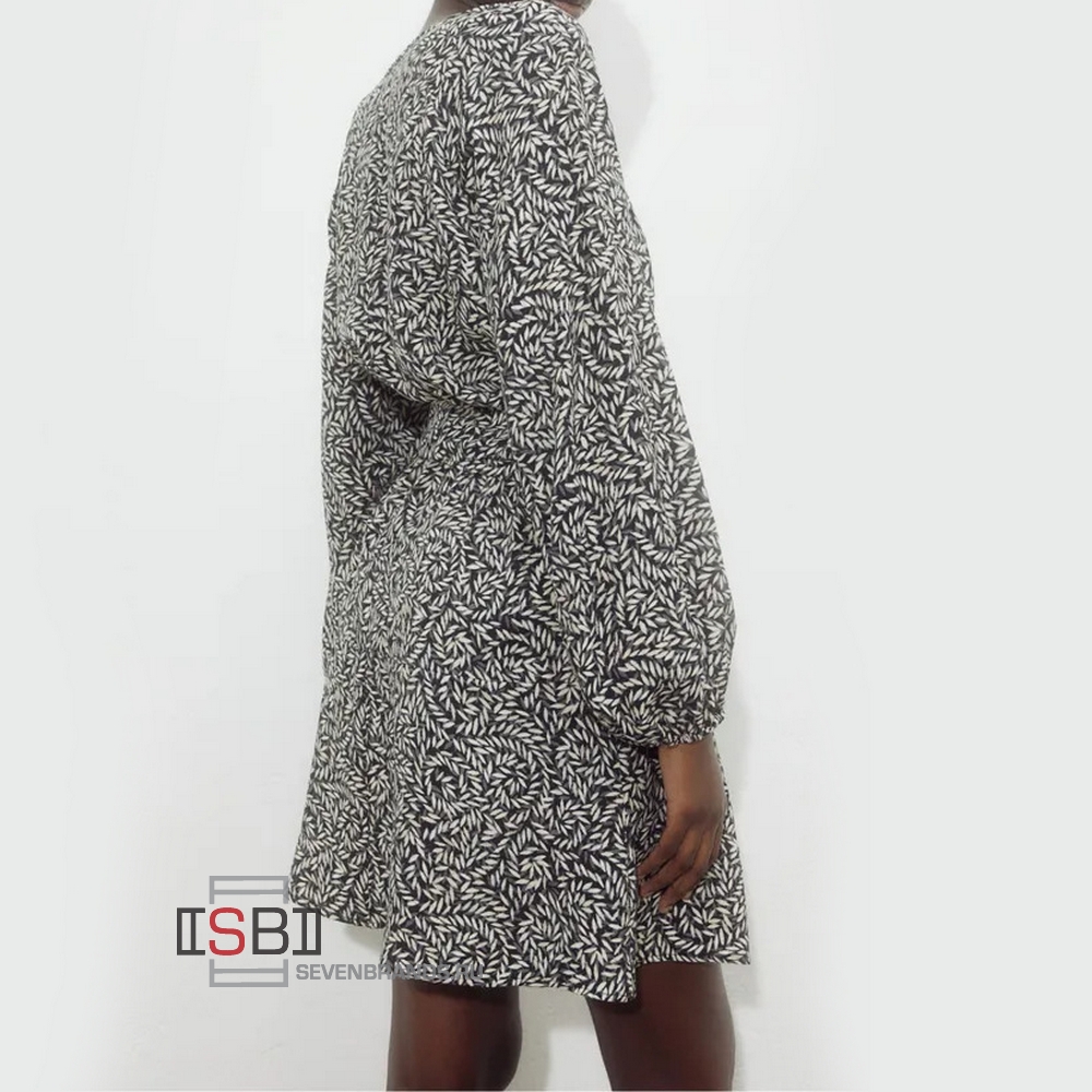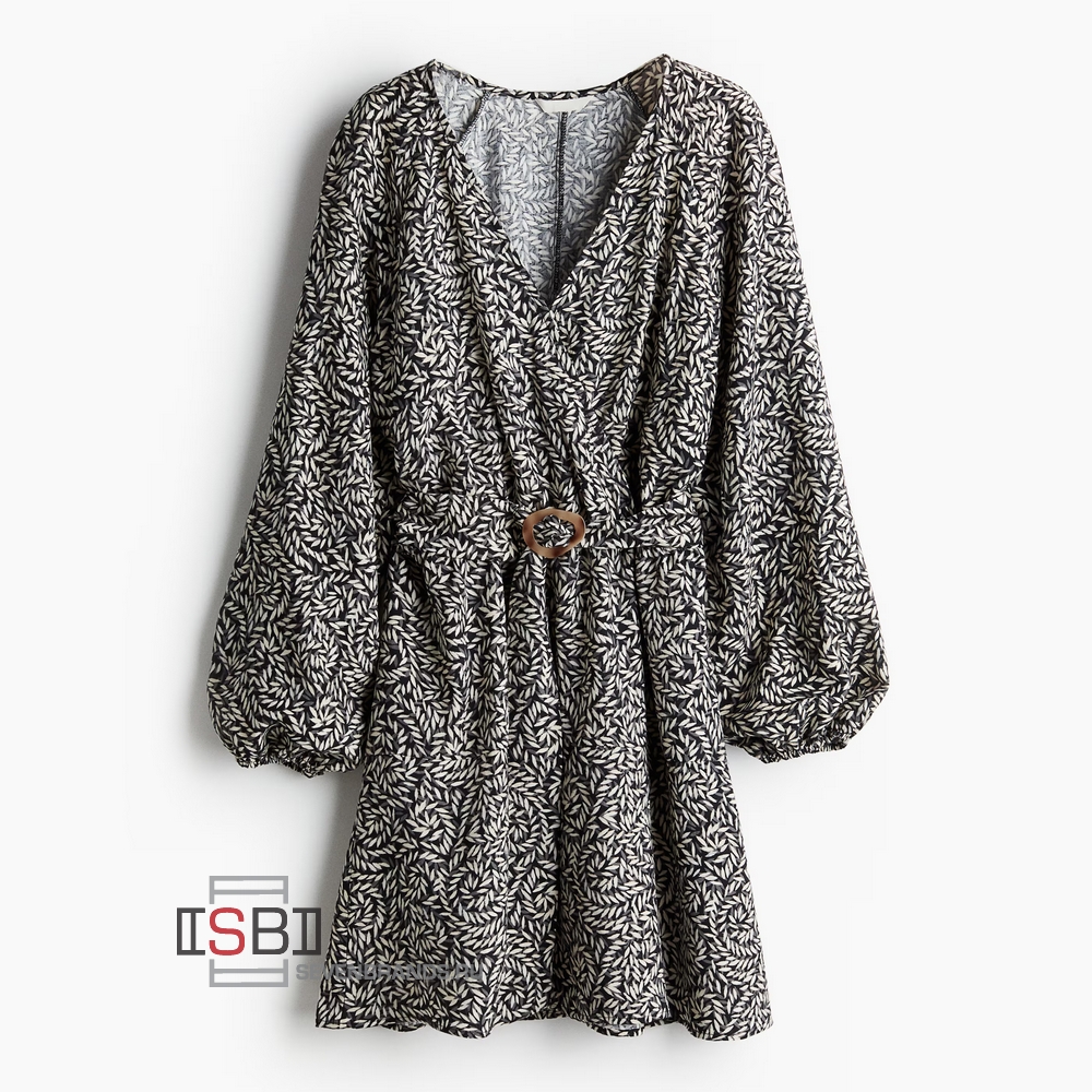 Короткое платье из тканого материала. Глубокий V-образный вырез, пришитый запах спереди, длинные рукава реглан с манжетами на узкой резинке. Пояс на потайной резинке, пояс с асимметричной пряжкой и расклешенная юбка. Без подкладки.