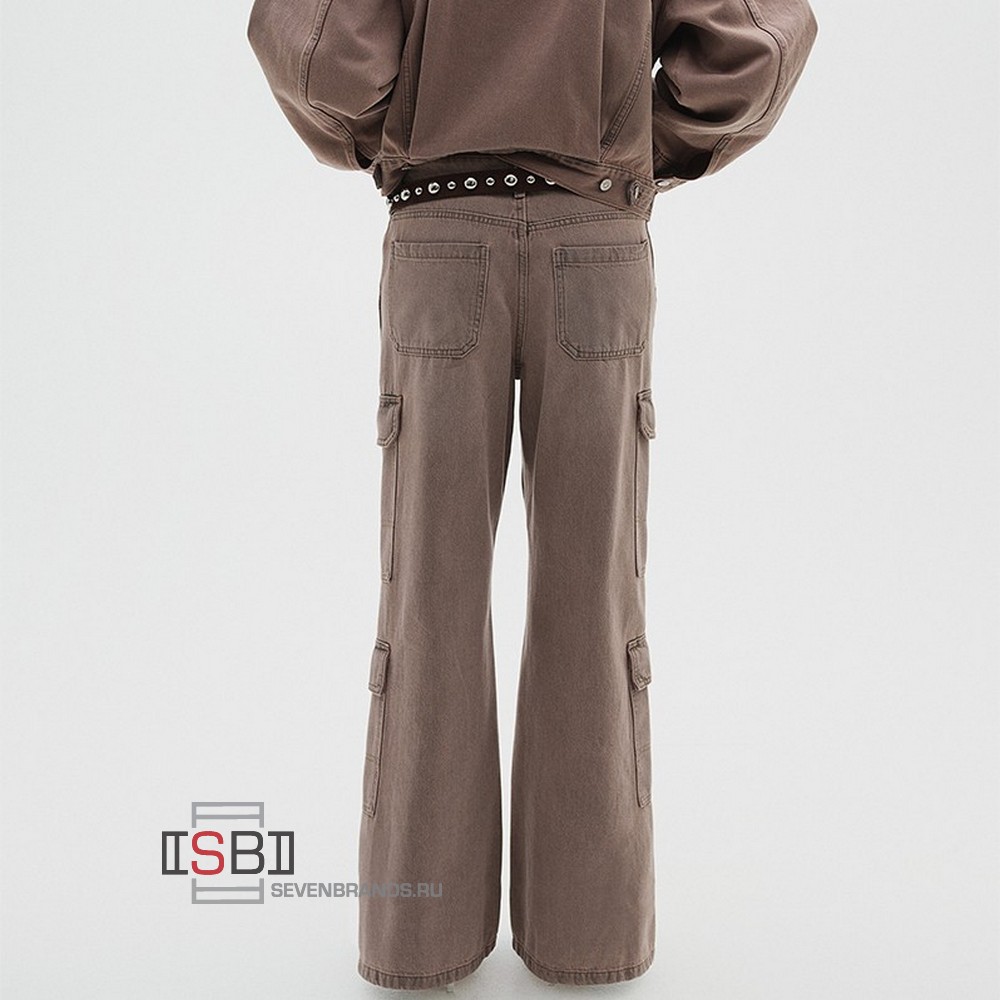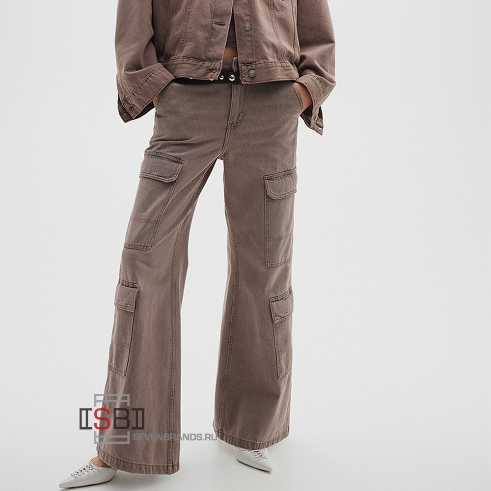 Брюки из хлопкового денима с застежкой на молнию и пуговицу, диагональными боковыми карманами и открытыми задними карманами. Широкие брючины с двумя карманами-книжками с клапанами на каждом.