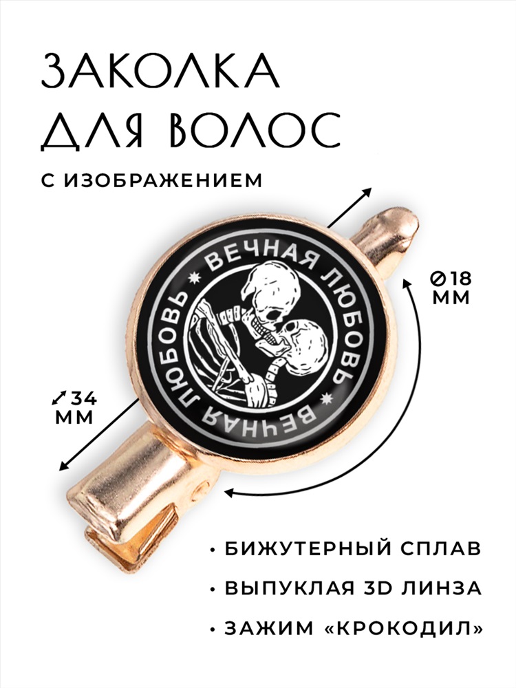 Заколка из бижутерного сплава с покрытием под розовое золото. Тип зажима "крокодил". Размер заколки: 34х20х15мм, диаметр изображения: 18мм. Изображение защищено выпуклой стеклянной линзой. Товар упакован в прозрачный пакет. Без описания.