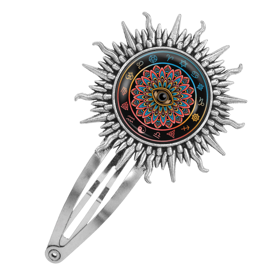 Заколка из бижутерного сплава с покрытием под серебро. Размер заколки: 77х45мм, диаметр изображения: 25мм. Изображение защищено выпуклой стеклянной линзой. Товар упакован в прозрачный пакет. Без описания.