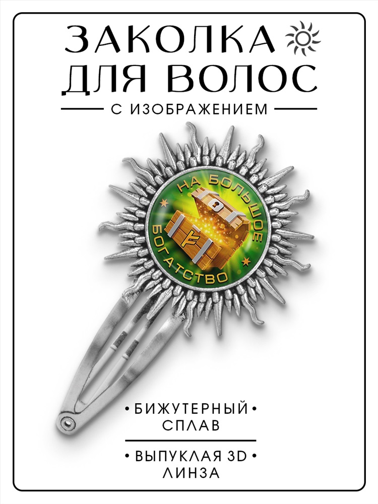 Заколка из бижутерного сплава с покрытием под серебро. Размер заколки: 77х45мм, диаметр изображения: 25мм. Изображение защищено выпуклой стеклянной линзой. Товар упакован в прозрачный пакет. Без описания.