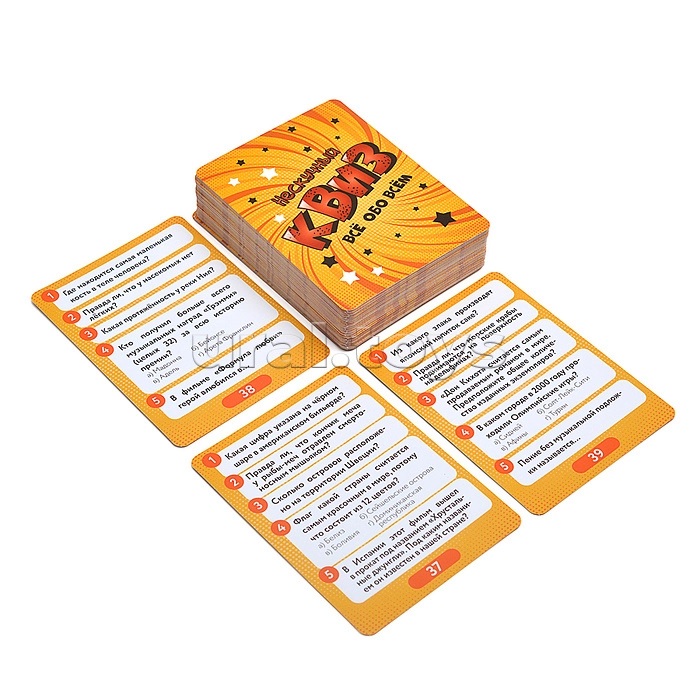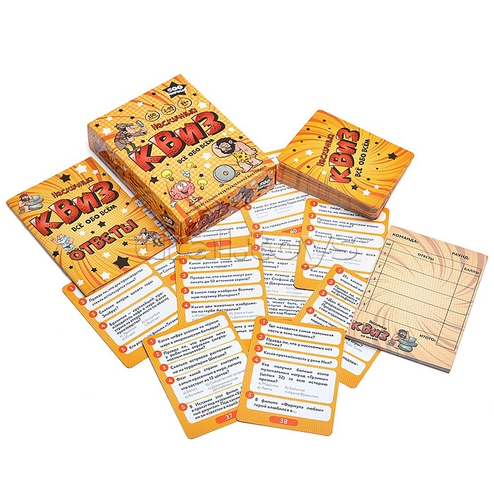 В наборе: - 100 карт с вопросами. - брошюра с ответами. - блокнот для записей. - правила игры. Материал: картон. Соответствует требованиям безопасности продукции. Для детей от 14 лет.