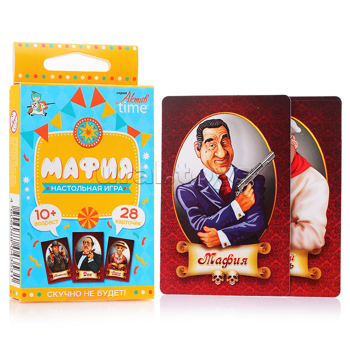 Наличие: >10 Собирайте семью и друзей и весело проводите время вместе с любимой командной настольной игрой «Мафия»! Станьте участниками детективной истории с увлекательным сюжетом, которая позволит вам проникнуться командным духом, потренировать актёрские способности, логику и интуицию! Состав: • карточки – 28 шт. (8,5 х 5,5 см) • инструкция В комплект игры входят следующие карты: • ведущий • дон • мафия • комиссар • доктор • мирный житель Игра предназначена для детей от 10 лет и рассчитана на 3–14 игроков. Как играть? Для карточной игры «Мафия» нет канонических правил. Наш карточный набор предлагает широко известный среди любителей данной игры вид правил, распространённый для так называемой «салонной мафии». Прежде чем начать игру, дети изучают карту и знакомятся с персонажами, определяют состав и очерёдность хода. В игру «Мафия» интереснее играть в составе 9–12 человек. Рекомендуемый набор карт в зависимости от количества игроков: • 6–8 участников – ведущий, мафия (2), комиссар, доктор, мирные жители (1-3) • 9–10 участников – ведущий, мафия (3), комиссар, доктор, мирные жители (3-4) • 11–14 участников – ведущий, мафия (4), комиссар, доктор, мирные жители (4-6) Комментарии к товару