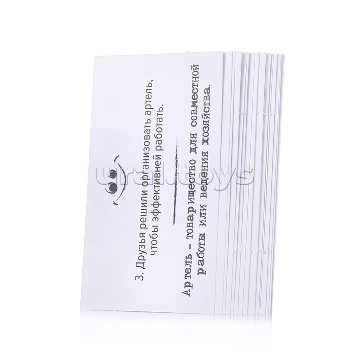 Наличие: >10 Состав игры: - карточки из картона - 108 шт. - правила - внутри упаковки Как играть: Перемешайте колоду и положите карточки ответами вниз. Первый игрок берет карту и зачитывает слово и три предложения с этим словом. Его задача: выбрать корректную фразу. Затем игрок переворачивает карту и зачитывает правильный ответ. Если он угадал, забирает карту себе; если не угадал - отправляет ее в сброс. Ход передается по часовой стрелке. Игра продолжается, пока не закончится колода. Для детей от 12 лет Комментарии к товару