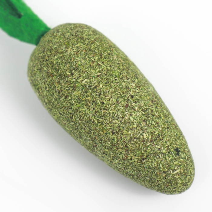 Кошачья мята имеет аромат, который особенно привлекает кошек. Играя с игрушкой, она может облизывать и обнюхивать мяту, что вызывает у нее ощущение удовольствия и блаженства. Сверху игрушки прикреплен мягкий текстиль в виде батвы, напоминая "Морковку".