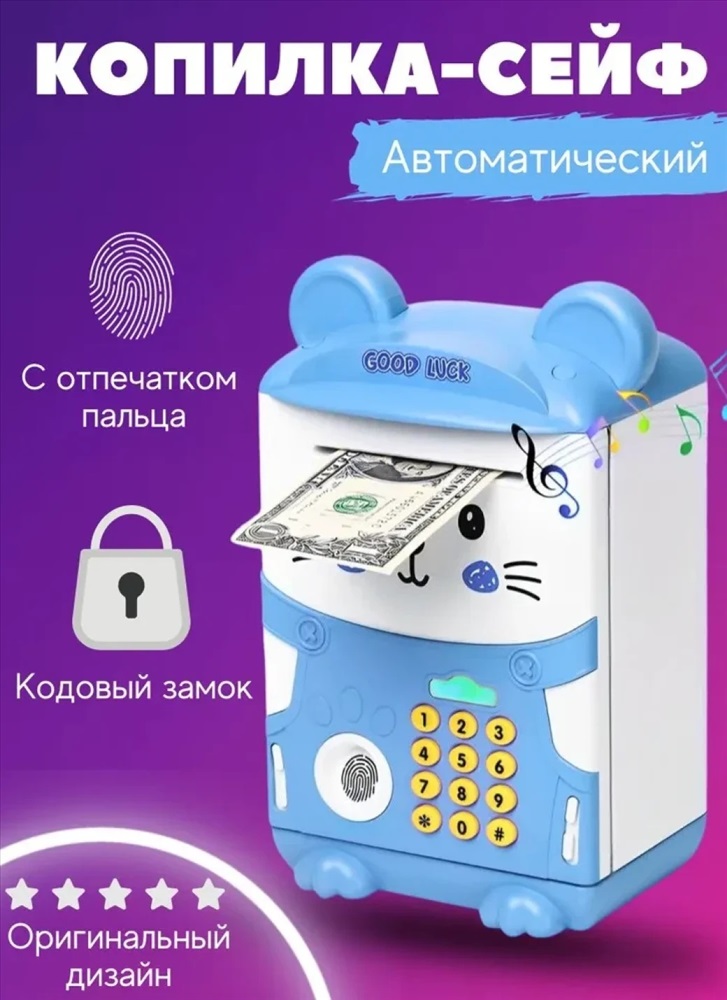 Копилка сейф работает на батарейках, принимает монеты и купюры.