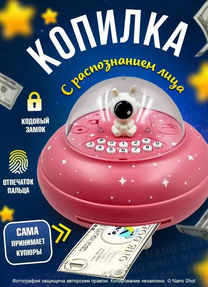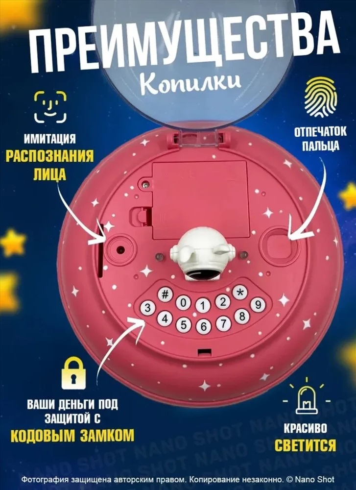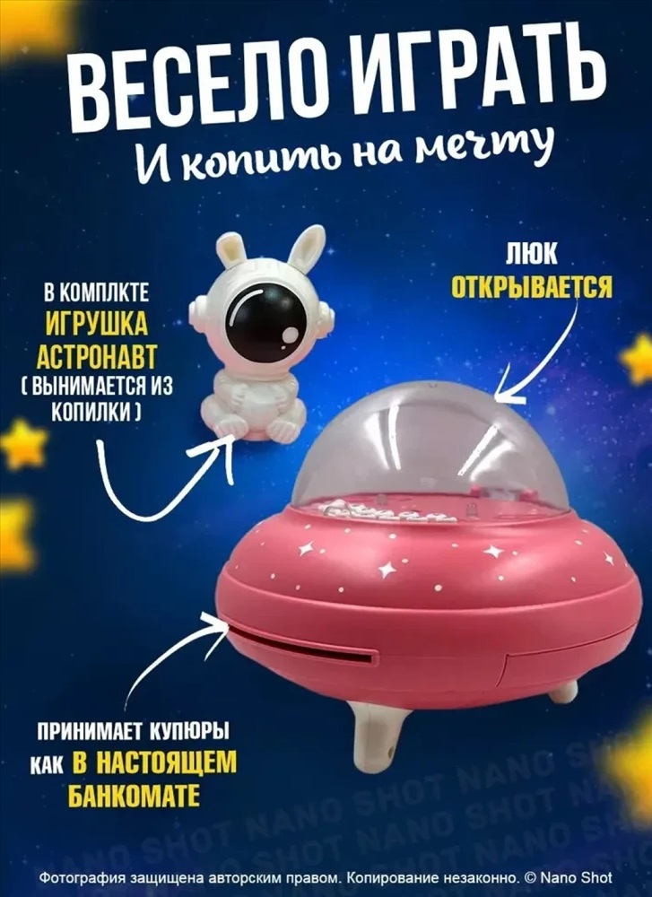 Производитель: Nano Shot; Состав: Пластик Копилка для денег летающая тарелка и астронавт - это интерактивный и забавный предмет, который поможет сделать процесс накопления денег более увлекательным. Эта копилка для монет выполнена в виде НЛО с астронавтом на борту, что придает ей уникальный и футуристический вид. Приблизившись к копилке, астронавт оживает, активируя различные световые и звуковые эффекты, создавая ощущение, что он действительно находится на космическом корабле. Копилка-астронавт оснащена специальным отверстием для монет, через которое вы можете бросить монеты и наблюдать за их перемещением внутри копилки. Когда астронавт видит, что вы бросаете монеты, он начинает двигаться и издавать звуки, как будто управляет своим космическим кораблем. Интерактивная музыкальная электронная копилка сейф - это удивительный подарок для дома и семьи. Эта декоративная копилка станет не только функциональным элементом интерьера, но и забавным способом сбережения денег. Сейф оснащен купюроприемником, который позволяет удобно вносить деньги, а также кодовым замком для безопасного хранения накоплений.С помощью этой копилки можно вдохновляться на новые мечты и цели, копить на путешествия, подарки или просто на приятные мелочи. Интерактивная функция добавляет удовольствие в процесс копления денег - каждый раз, когда вы кладете монету или купюру, копилка издает музыкальный сигнал или звуковой эффект, что делает процесс еще более увлекательным.Эта копилка идеально подойдет как подарок на день рождения девочке или подростку, а также станет отличным сувениром на свадьбу, новоселье или другой праздник. Оригинальный декор с уникальным дизайном НЛО летающей тарелки копить придаст вашему дому уют и тепло.Не упустите возможность приобрести этот интересный и практичный товар для дома по выгодной цене на распродаже. Удивите своих близких и друзей оригинальным подарком, который будет радовать их каждый день. Создайте свою семейную копилку счастья с этой уникальной электронной копилкой сейфом!