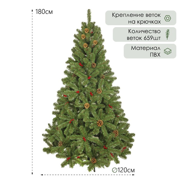 Габариты: 110 x 26 x 26 Доставка: Платная Страна: Россия В боксе: 1 шт Состав: Металл, ПВХ Материалы: металл, ПВХ Фасовка: по 1 шт Индивидуальная упаковка: Картонная коробка Сертификат: Не подлежит сертификации Высота, см: 180 Диаметр нижнего яруса, см: 115 Символ года: Нет Тематика праздника: Новый год Материал: Металл, ПВХ Работает от сети: Нет Тип ёлки: Напольная Тип веток: ПВХ Крепление веток: На крючках Особенности декора: Шишки Стиль: Новогоднее барокко, Датский, Фьюжн, Ар-деко, Шебби-шик, Классика, Советский, Скандинавский Цвет хвои: Зелёный Цвет декора: Красный, Коричневый Высокая искусственная ёлка с натуральным оттенком и декором из ягод и шишек станет центральным элементом праздничного интерьера. Объёмная крона из 586 ПВХ веток на крючках создаёт плотную и выразительную форму, подчёркивая зелёный цвет хвои и акценты красного и коричневого в украшениях. Особенности