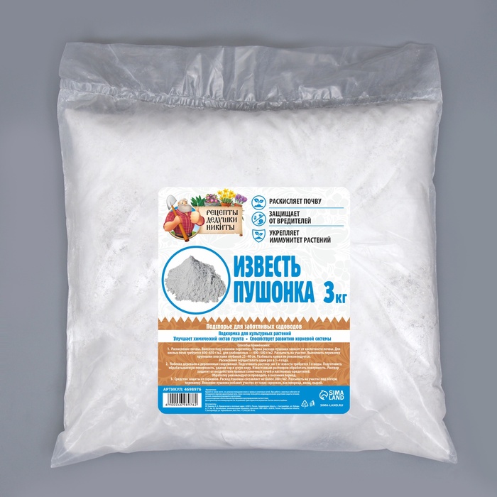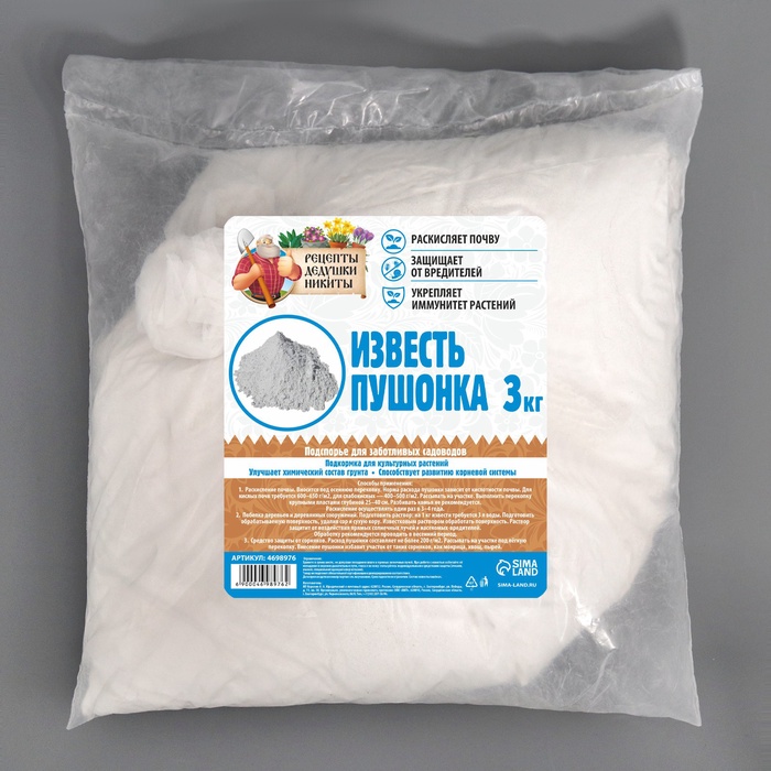 Производитель: Рецепты дедушки Никиты; Габариты: 25 x 24 x 8; Доставка: Платная; Страна: Россия; В боксе: 1 шт; Состав: См. на упаковке; Материалы: см. на упаковке; Фасовка: по 1 шт; Индивидуальная упаковка: Пакет; Сертификат: Не подлежит сертификации; Область применения: Универсальные; Происхождение: Минеральные (неорганические); Препаративная форма: Порошок; Вид: Удобрения; Состав (действующее вещество): Кальций; Периоды применения: Весна, Осень; Комплексные удобрения: Нет; Класс опасности: 4 класс (мало опасные); Группы элементов: Макроудобрения; Эффект: Плодоношение; Вес/Объём: 3 кг