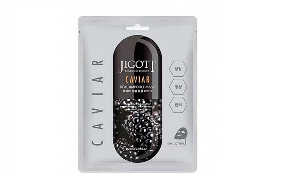 Маска для лица, пропитана эссенцией, обогащенной экстрактом икры. Икра богата витаминами, минералами и микроэлементами, которые питают и укрепляют кожу. Экстракт черной икры оказывает подтягивающее действие. Маска улучшает кровообращение, повышает упругость, эластичность и способствует выработке собственного коллагена и эластина, которые улучшают состояние кожи и продлевают ее молодость. Активные компоненты в составе маски Jigott Caviar Real Ampoule Mask: гиалуроновая кислота, бетаин, экстракт красного женьшеня, экстракт жемчуга и витамин Е обладают увлажняющими и восстанавливающими свойствами. Для изготовления маски был использован натуральный экологически-чистый хлопок, который не вызывает аллергии и отлично прилегает к коже.