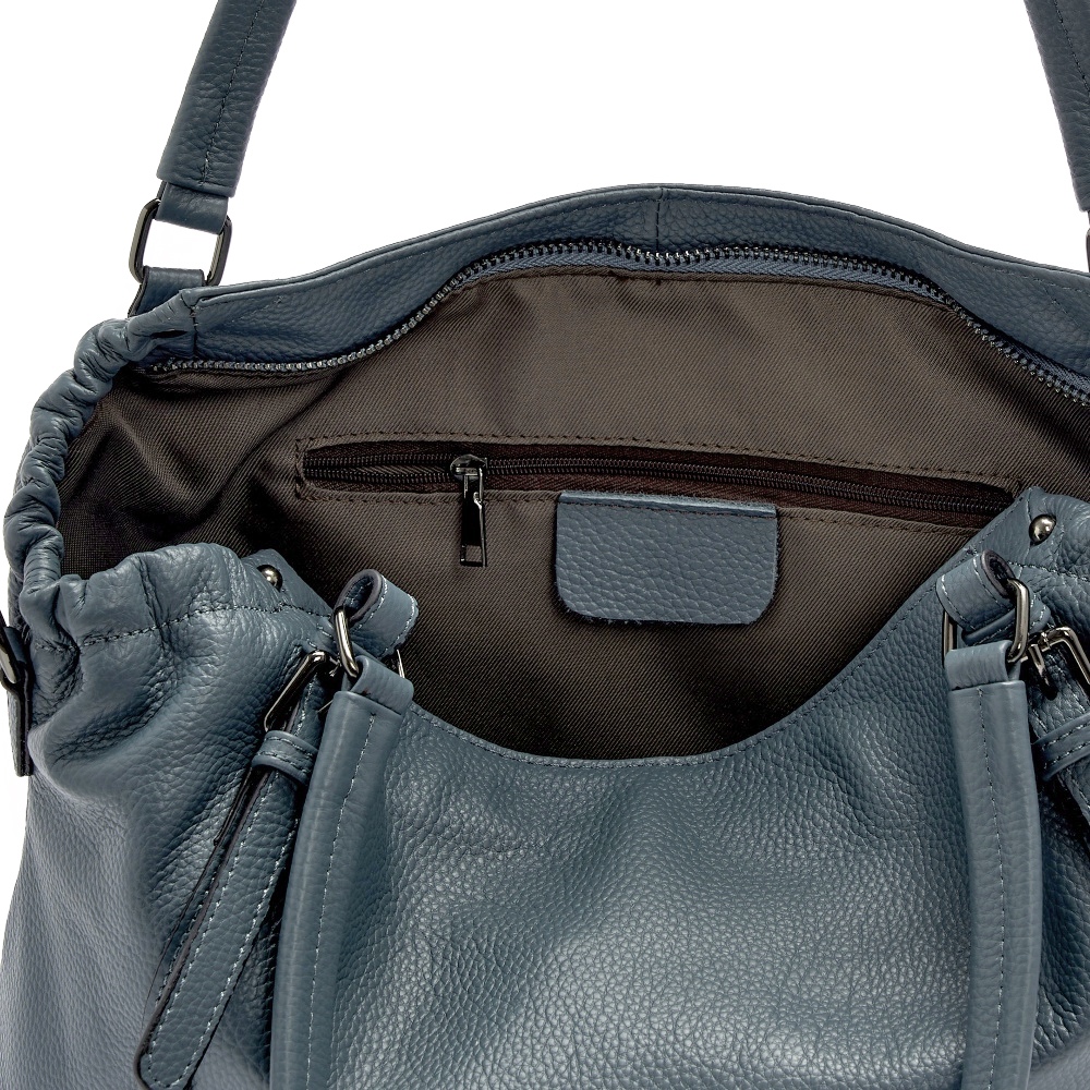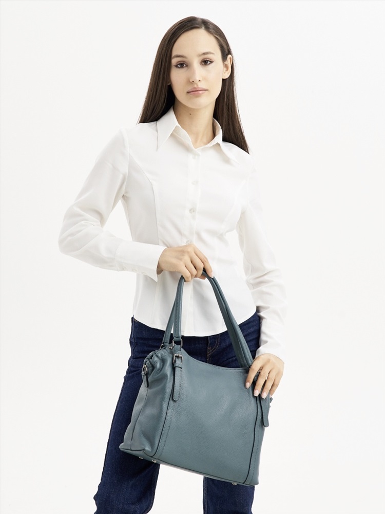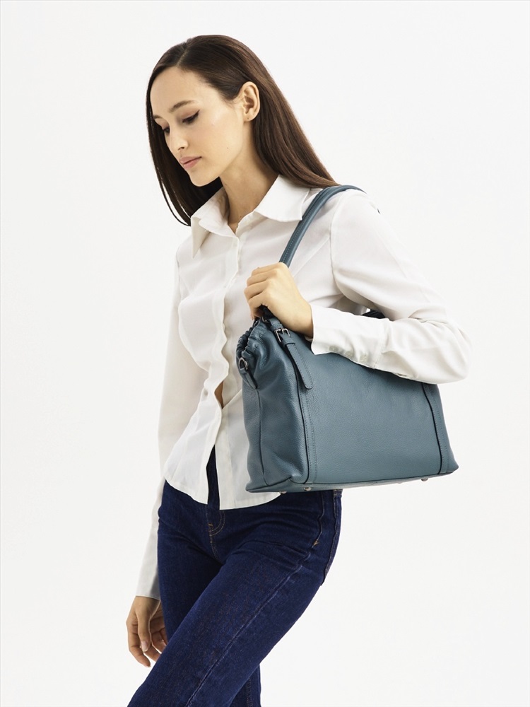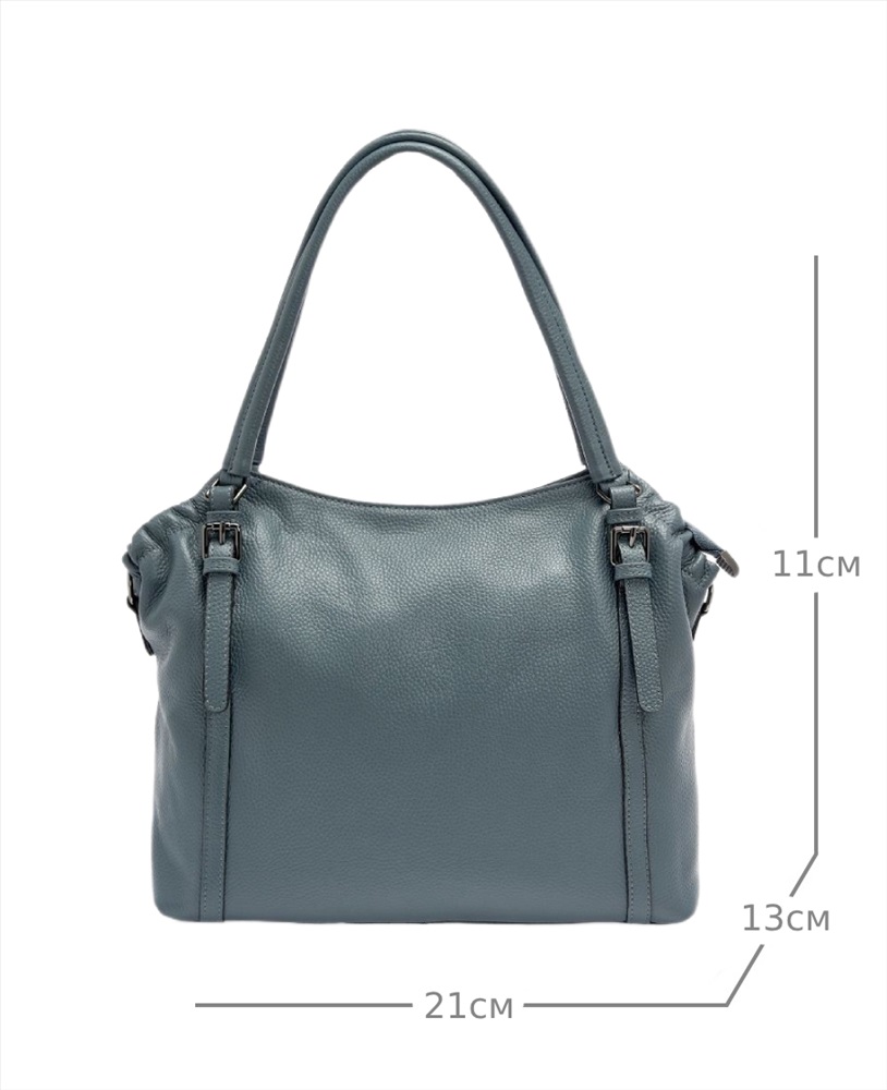 Бренд: Jane's Story Вид изделия: Женская сумка Материал изделия: Натуральная кожа Форма сумки: Тоут / Хобо / Шоппер / Сумка-мешок Основной цвет: Голубой Внешние карманы: 1 Ширина (см): 34 Высота (см): 27 Глубина (см): 13 Высота ручки (см): 23 Длина плечевого ремня: 135 Состав: 100% натуральная кожа Количество отделений: 3 Внутренние карманы: 3 Вид застежки: Молния Цвет фурнитуры: черный никель Подклад: Полиэстер Формат а4: ДА Подарочная упаковка: Нет Объем (л): 11 Каркас: полужесткий Вес (г): 1000 Гарантия: 3 месяца, Женская сумка шоппер выполнена из качественной натуральной кожи, которая имеет невероятно мягкую и приятную на ощупь зернистую фактуру. Сумочка большая габариты (ВхШхГ) 27х34х13 см. с подкладом из плотного полиэстера. Основное отделение разделено карманом-перегородкой на молнии. Внутри есть 2 открытых кармана и 1 карман на молнии. Вмещает документы формата А4. Снаружи сзади карман на молнии для проездного и ключей. В комплекте плечевой ремень, регулируется по длине до 135 см., высота ручек 23 см., поэтому сумку удобно носить на руке, на плечо и через плечо как кросс-боди. Уплотненное дно и металлические ножки обеспечивают устойчивость и защиту изделия. Фурнитура сумки с двумя ручками выполнена в металле цвета черного никеля. Сумка с застежкой поставляется в текстильной (пыльник) и полиэтиленовой упаковке, что защищает ее от повреждений, а также позволяет удобно хранить женскую сумочку в дальнейшем использовании. Комментарии к товару