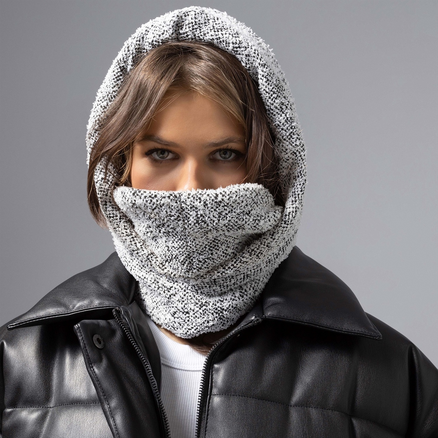Городская леди таит свои чувства под уютным капюшоном ЧАРУТТИ, выбирает маршрут без оглядки и никогда не теряет своего шарма. Мягкая текстура, аристократичный серый – просто надень, и весь город подчинен тебе. Капюшон-балаклава из вязаного трикотажа легко драпируется, плотно прилегает, защищая от ветра. Можно прикрывать лицо и нет. Идеально для городских прогулок и дерзких образов с настроением свободы. Глубина изделия 30 см, двусторонний.