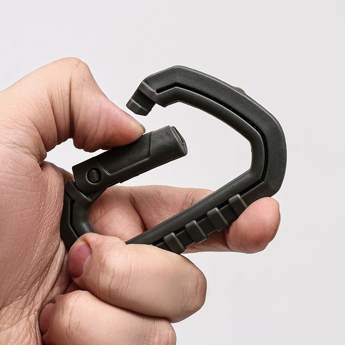 Карабин - универсальное устройство для крепления и фиксации снаряжения. Изделие может использования во время активного отдыха (поход, охота, рыбалка) в качестве подвеса или для быстрой замены сломавшегося фастекса на рюкзаке.