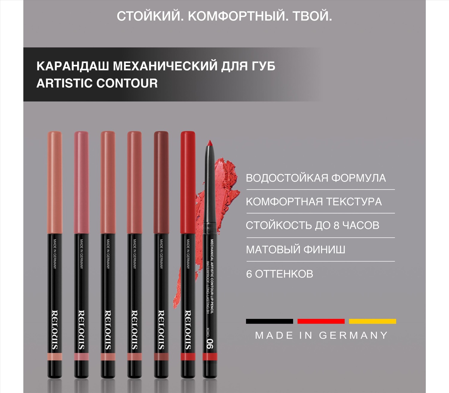 Бренд: RELOUIS; Водостойкость: да; Изготовитель: ООО "РЕЛУИ БЕЛ", Республика Беларусь, 220002, г. Минск, пр-т Машерова, 25-422; Оттенок: 04; Свойства: Матовый эффект; Серия: Artistic Contour; Тип: Карандаш-стик; Эффект: Стойкость