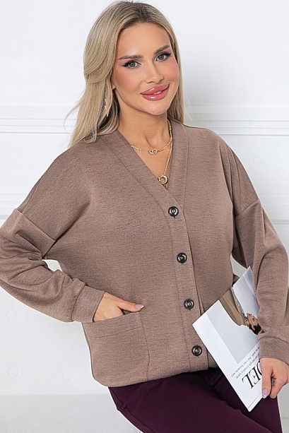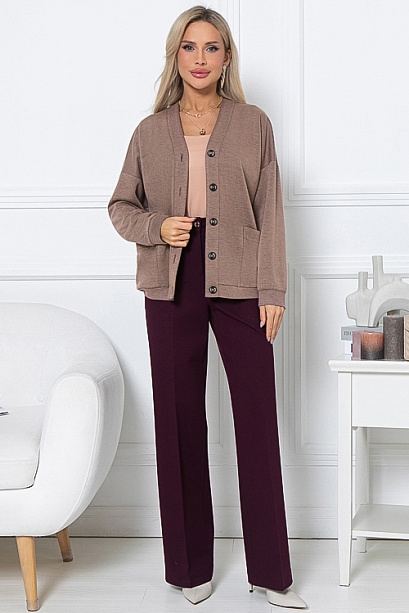 • Кардиган  свободного силуэта из комфортного  трикотажа с центральной застежкой по переду на петли и пуговицы, с удобными накладными карманами.