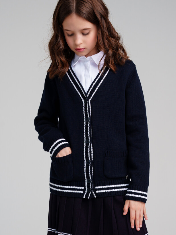 Классический темно-синий школьный вязаный кардиган для девочки подростка от PlayToday — стильная и универсальная кофта для школы, которая легко станет любимой частью гардероба. Прямой силуэт и застёжка на пуговицы придают кардигану элегантный вид, а лаконичный дизайн позволяет сочетать его с любыми школьными вещами.