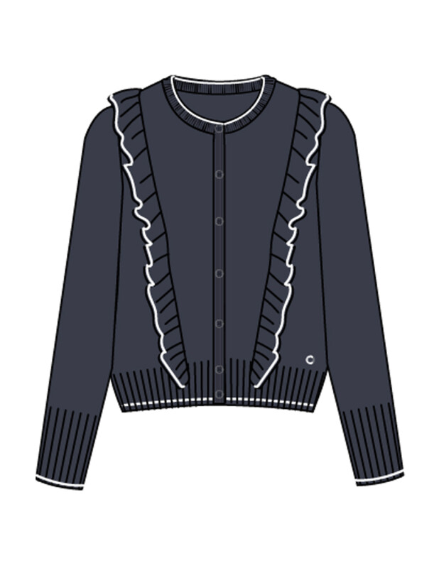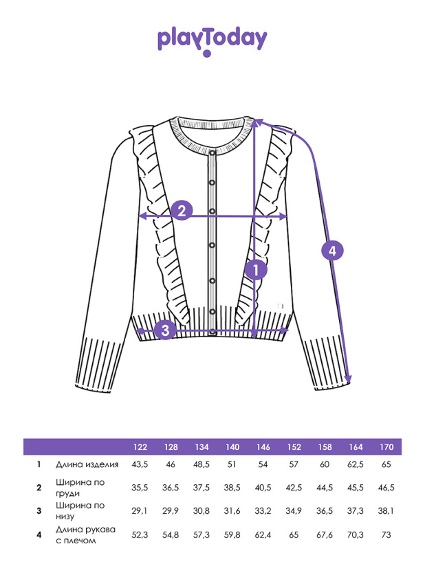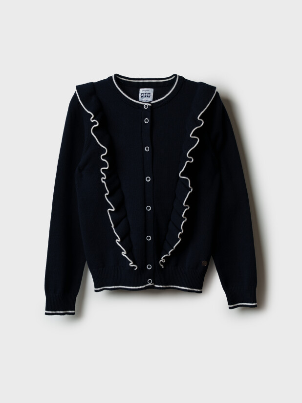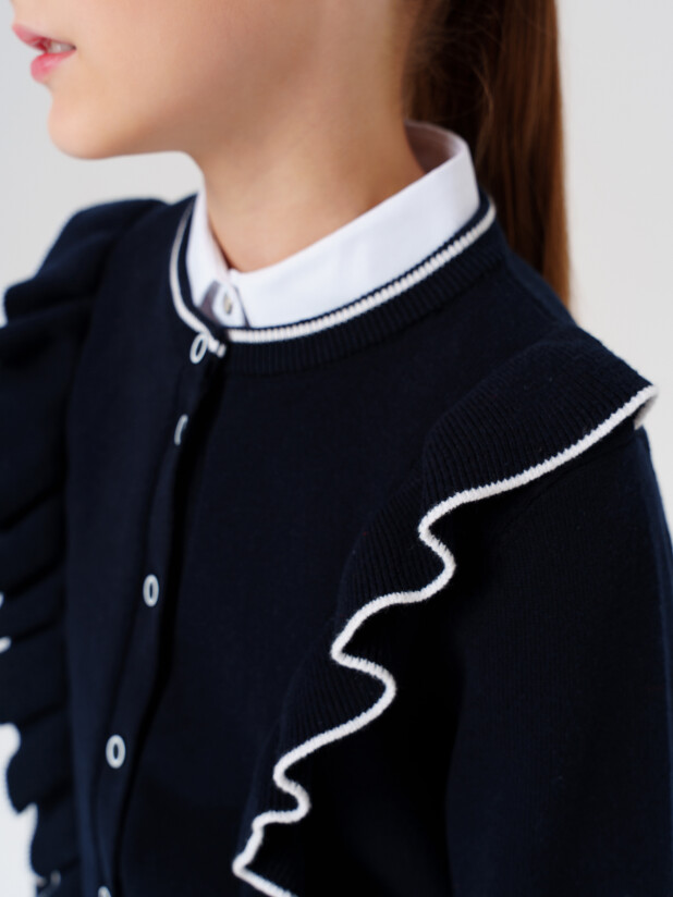 Декор из рюш добавляет модели нотку нежности и праздничности, благодаря чему классический трикотажный кардиган для девочек подходит и для школы, и для особых случаев. Универсальный синий цвет прекрасно сочетается с юбками, брюками и сарафанами из коллекции PlayToday.