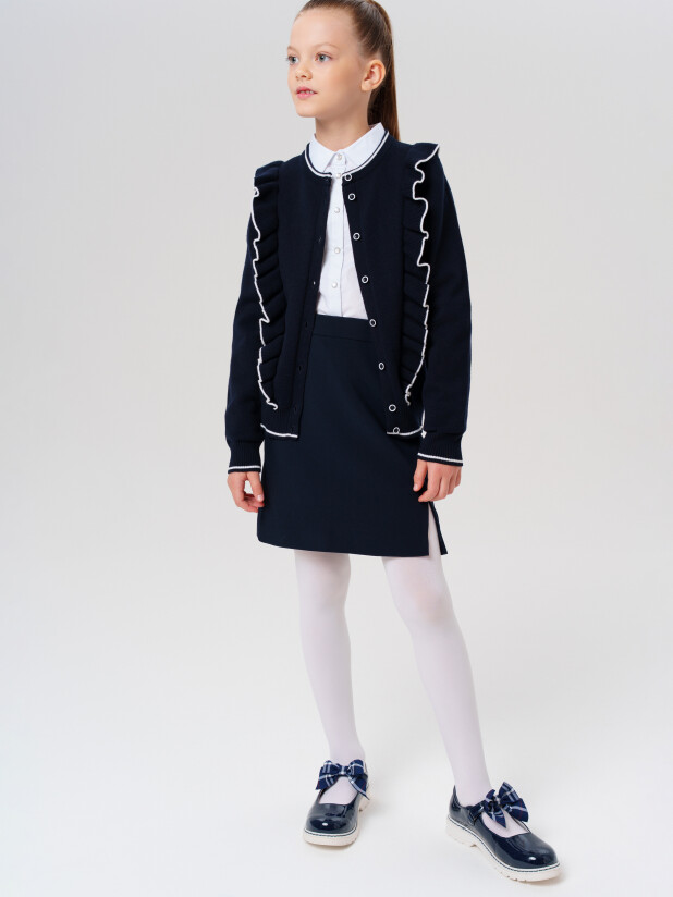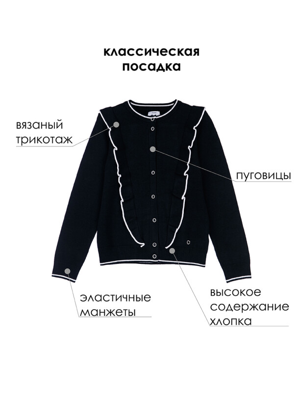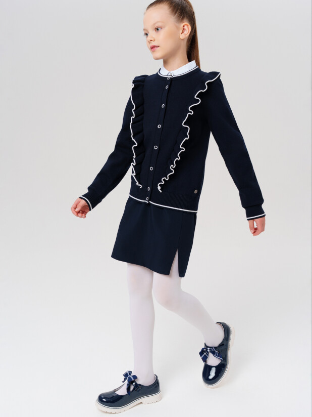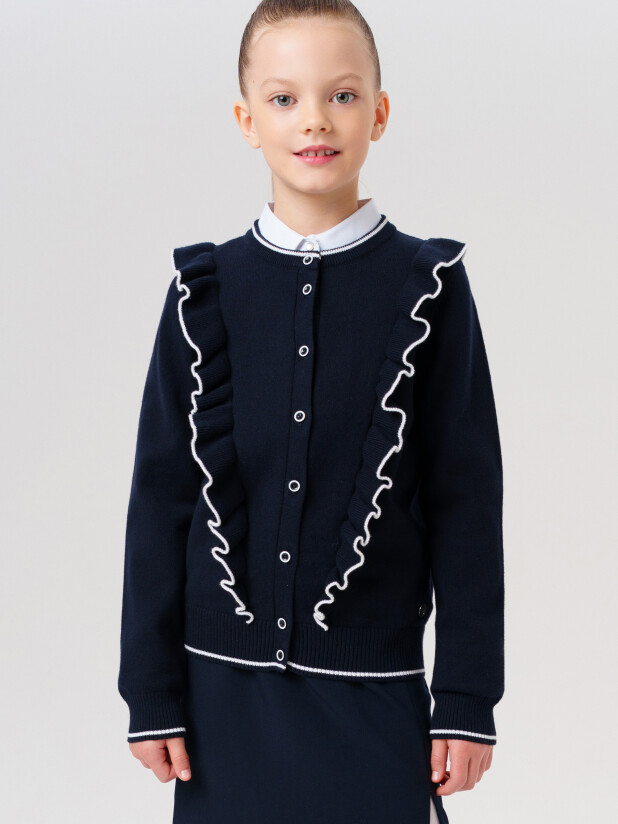 Классический темно-синий школьный вязаный кардиган для девочки подростка от PlayToday — стильная и универсальная кофта для школы, в которой сочетаются элегантность и комфорт. Модель прямого силуэта выполнена из вязаного трикотажа с высоким содержанием хлопка, а нежный декор из рюш придаёт образу особую утончённость.