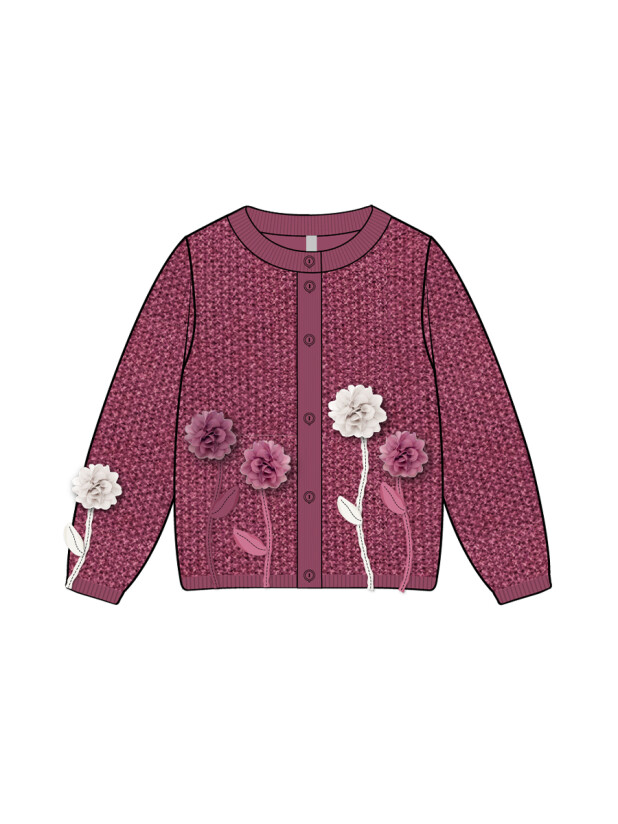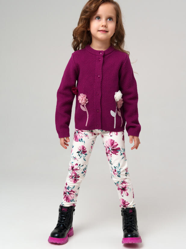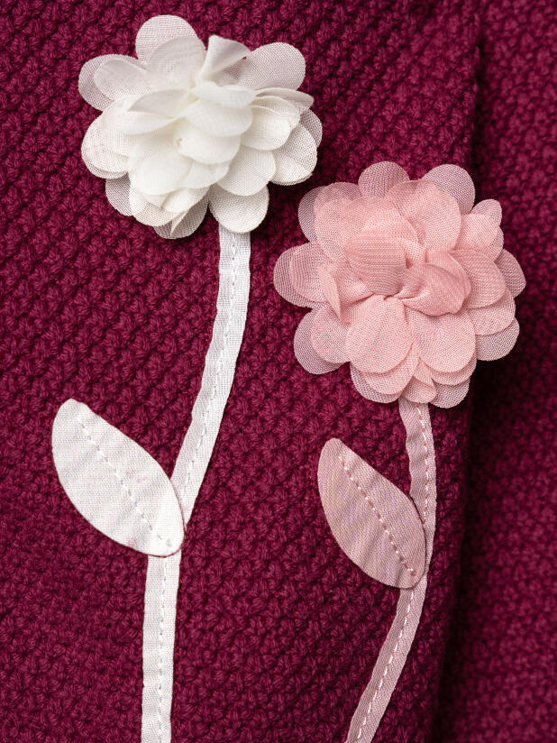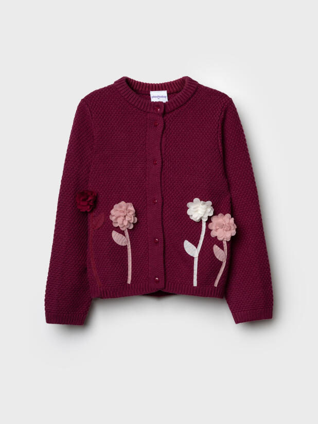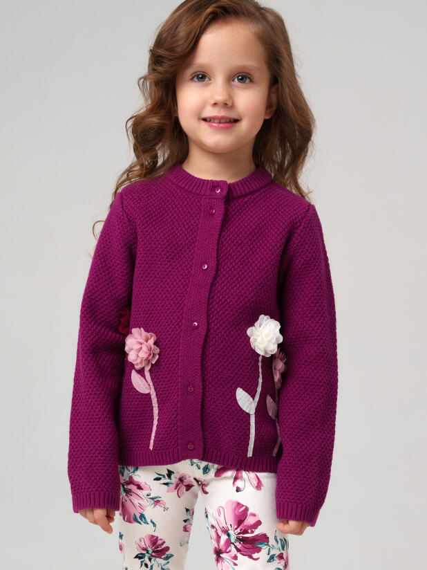 Сочетайте бордовый кардиган для девочки PlayToday с белой блузкой или футболкой для детского сада, с джинсами для прогулок или с праздничным платьем для утренников. Цветочный декор на кардигане создаёт яркий акцент и делает образ завершённым.