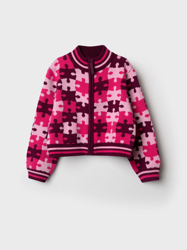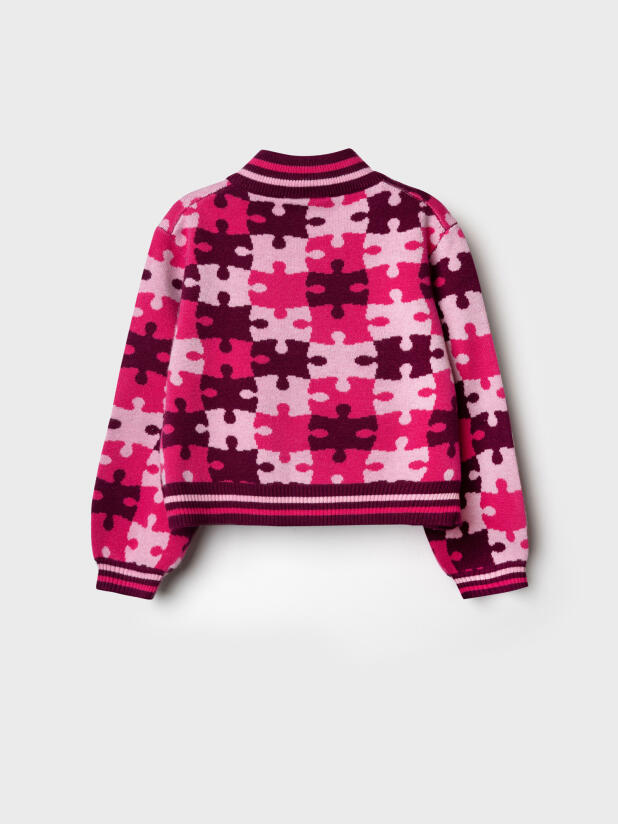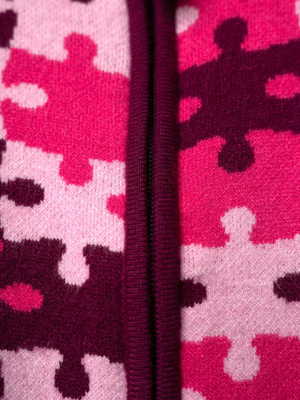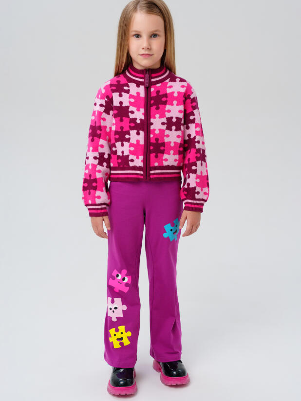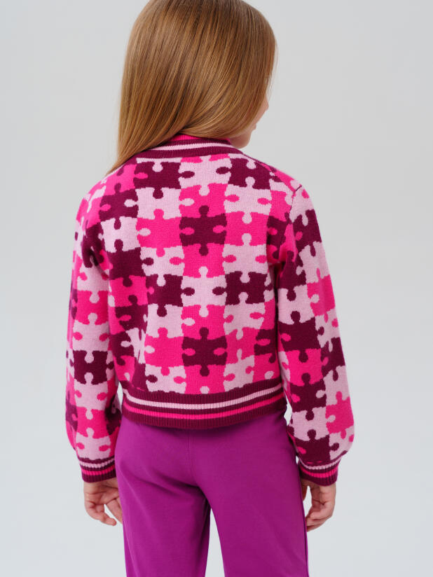 Вязаный розовый детский кардиган для девочки от PlayToday — тёплая и уютная вещь на каждый день, созданная специально для маленьких модниц. Яркий принт в виде пазлов привлекает внимание и создаёт настроение, а мягкий состав делает кардиган особенно приятным к телу. Идеально подойдёт для детского сада, прогулок и домашних игр.