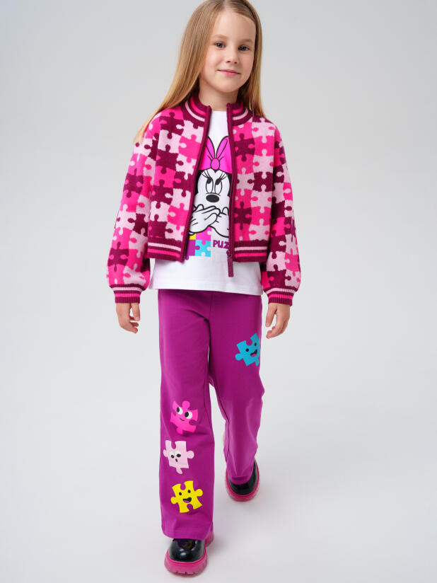Кардиган с ярким рисунком легко комбинируется с однотонным низом — например, с джинсами или штанами в спокойной гамме. Для завершения образа добавьте шапочку и утеплённые кроссовки — и ваш ребёнок готов к весёлым приключениям!