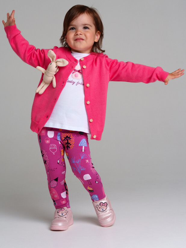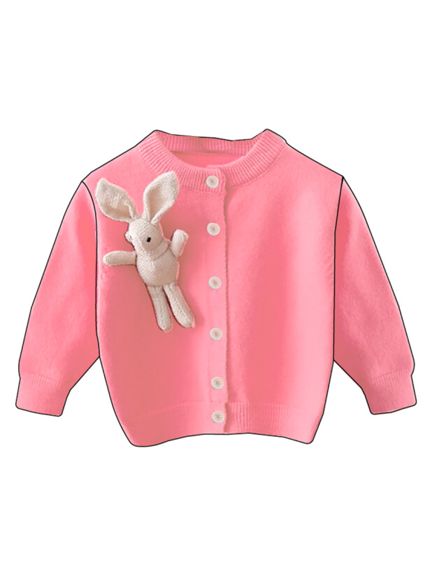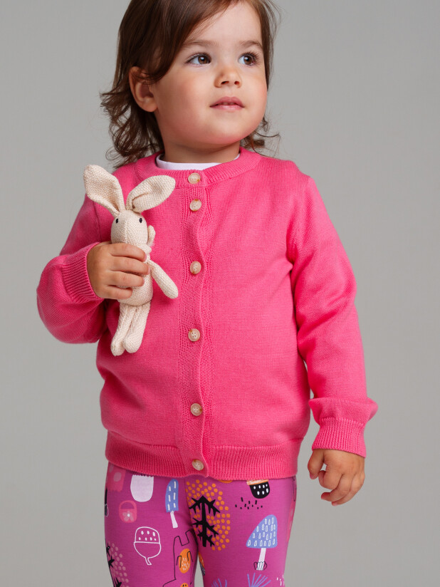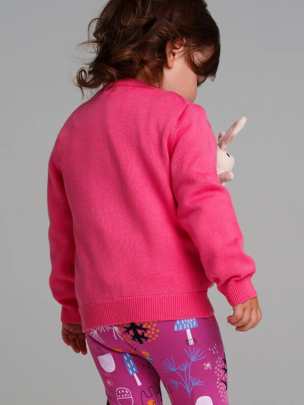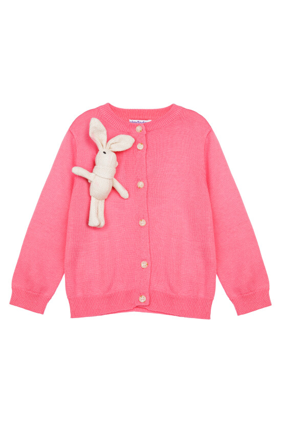 Кардиган из вязаного трикотажа. Застежка на пуговицы. Горловина, манжеты и низ изделия в рубчик. Пряжа с содержанием хлопка. Декор в виде мягкой игрушки.