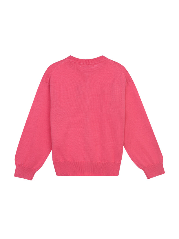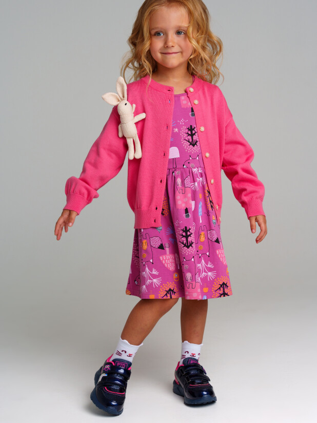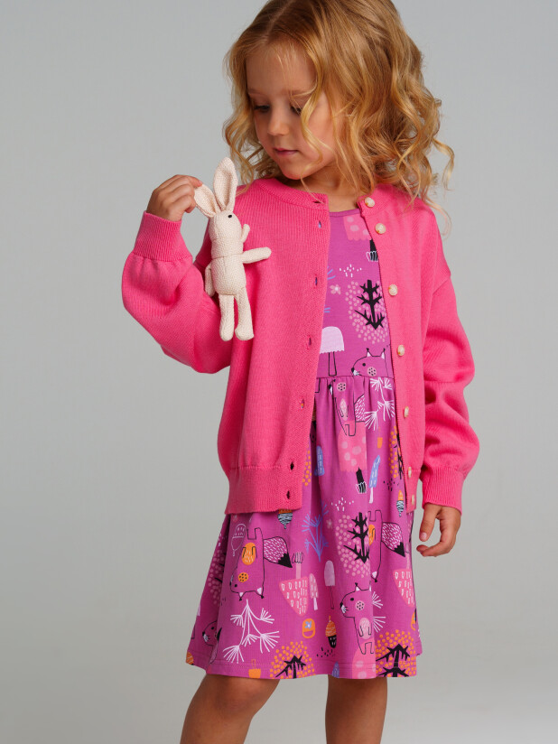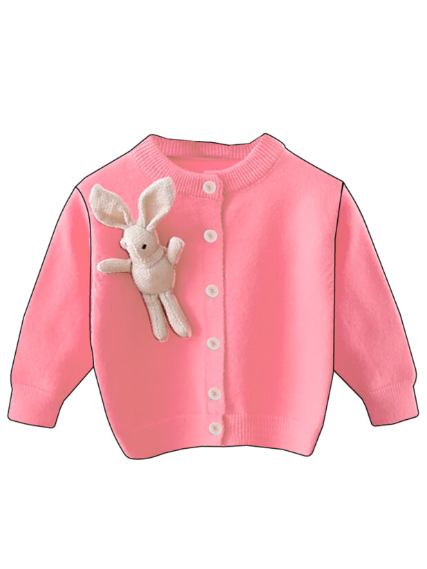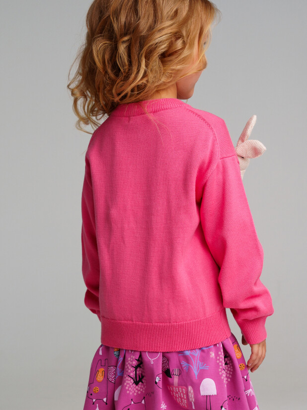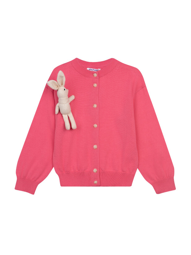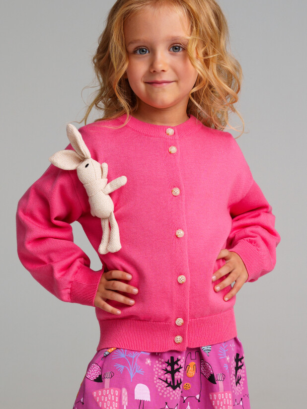Кардиган из вязаного трикотажа. Застежка на пуговицы. Горловина, манжеты и низ изделия в рубчик. Пряжа с содержанием хлопка. Декор в виде мягкой игрушки.