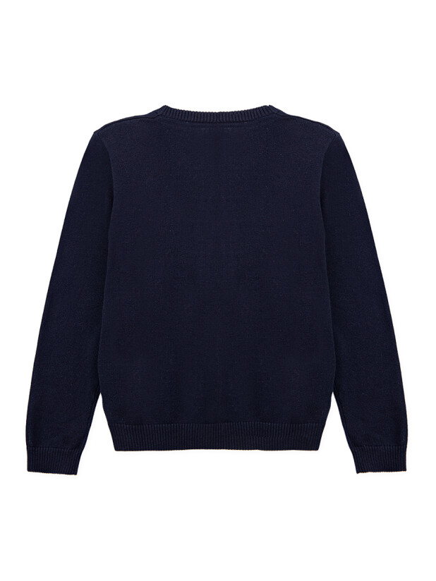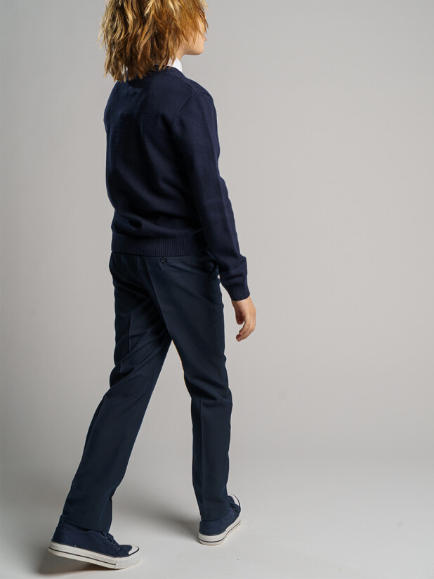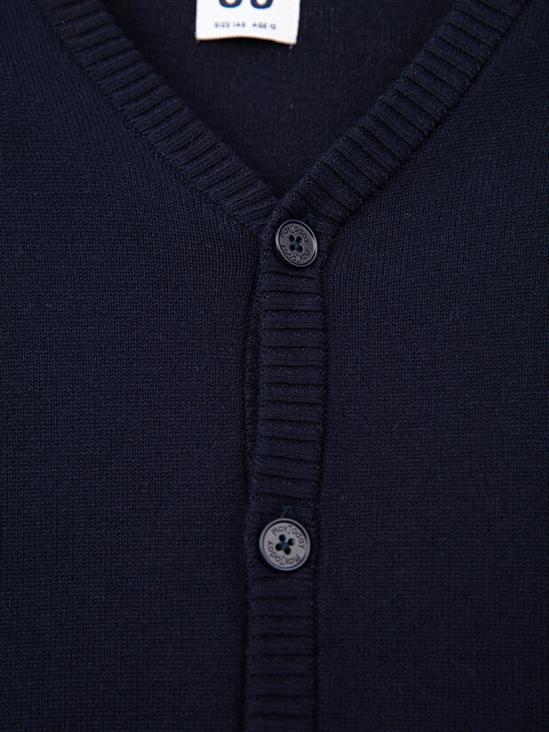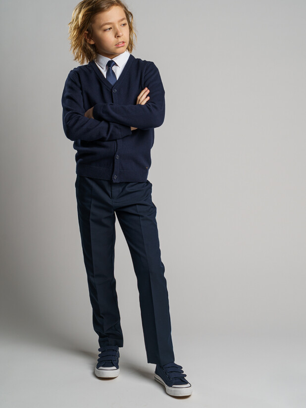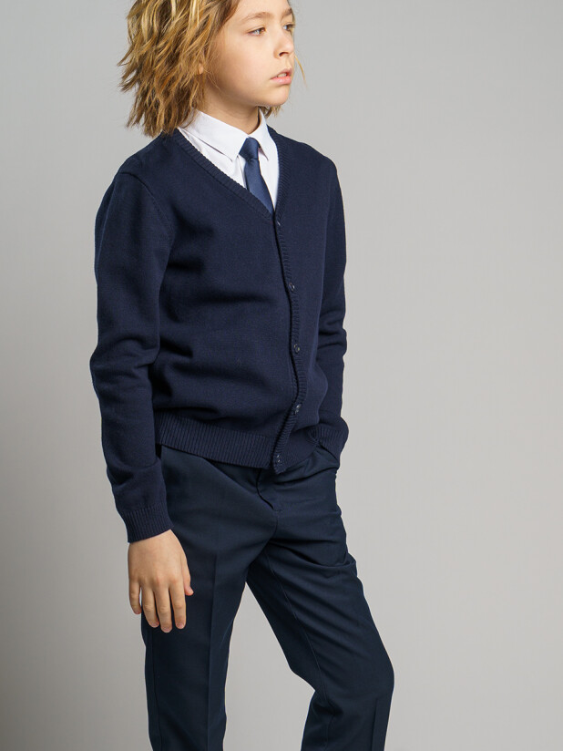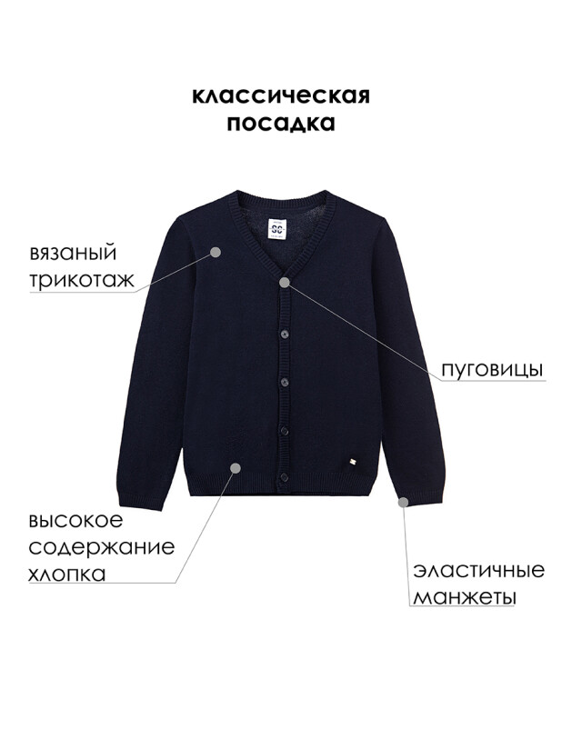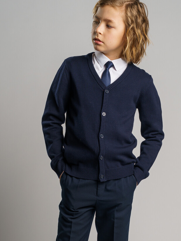 Классический темно-синий школьный вязаный кардиган на пуговицах для мальчика подростка от PlayToday — универсальный элемент гардероба, который легко дополнит школьную форму и создаст аккуратный, элегантный образ. Идеален для школы, прогулок, 1 сентября и официальных мероприятий.