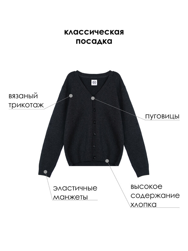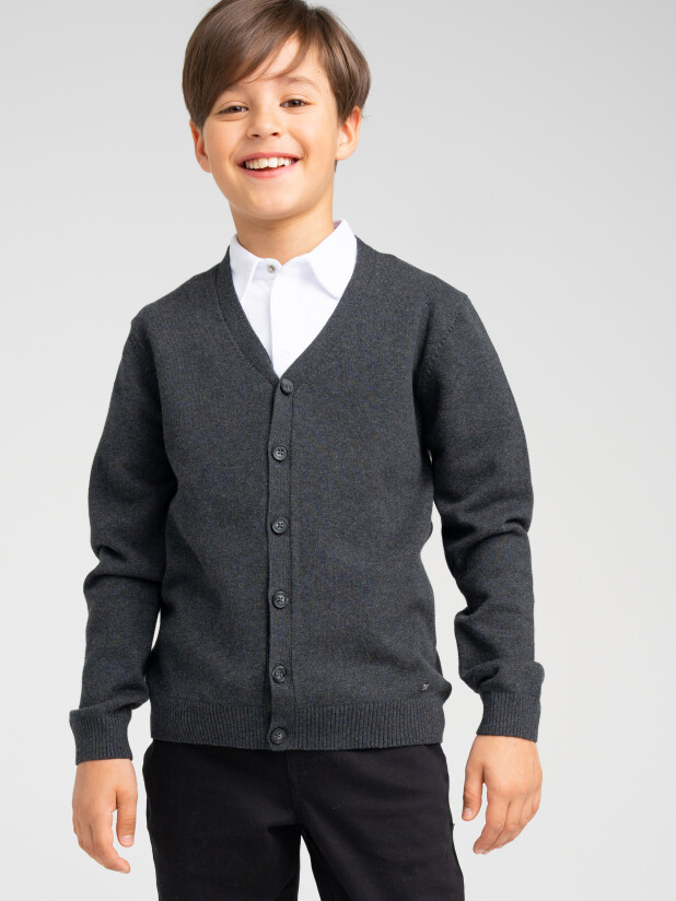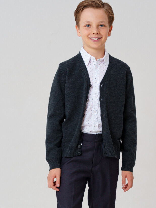 Этот серый подростковый кардиган для школы комфортно садится по фигуре и не стесняет движений — идеально для активных школьников. Прямой силуэт позволяет носить его поверх рубашки, футболки или поло, создавая элегантный и собранный комплект в школу или особых случаев.