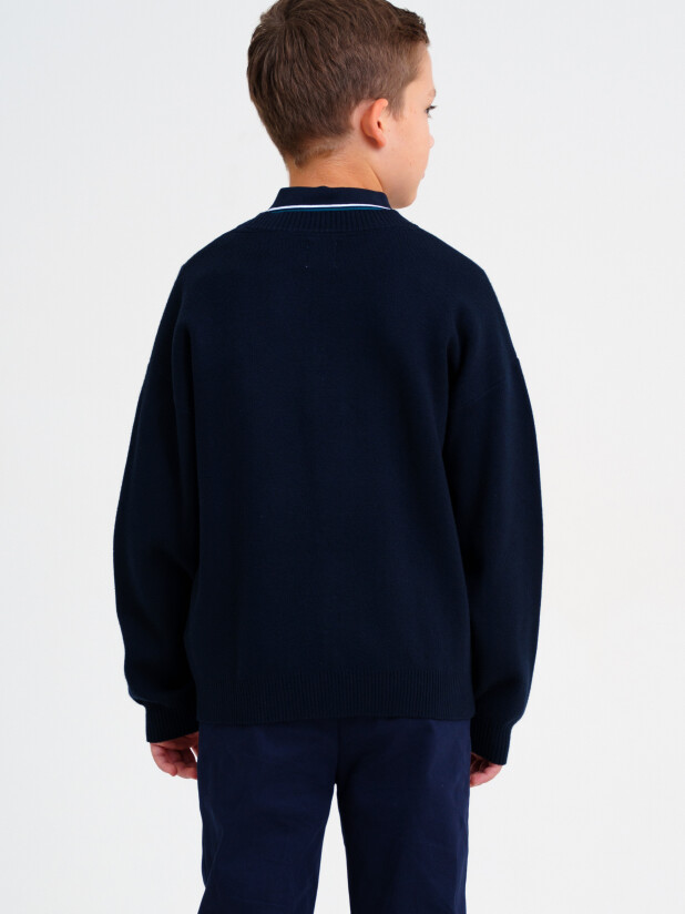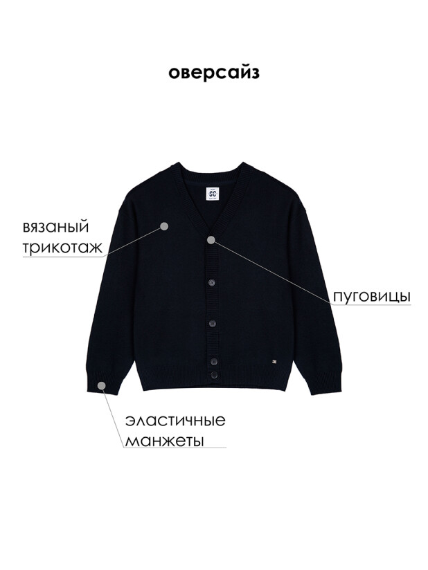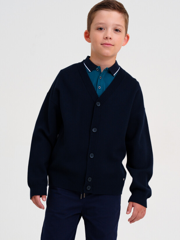 Школьный синий вязаный кардиган оверсайз для мальчика подростка от PlayToday — трендовая и комфортная кофта для школы, в которой сочетаются стиль и свобода движений.