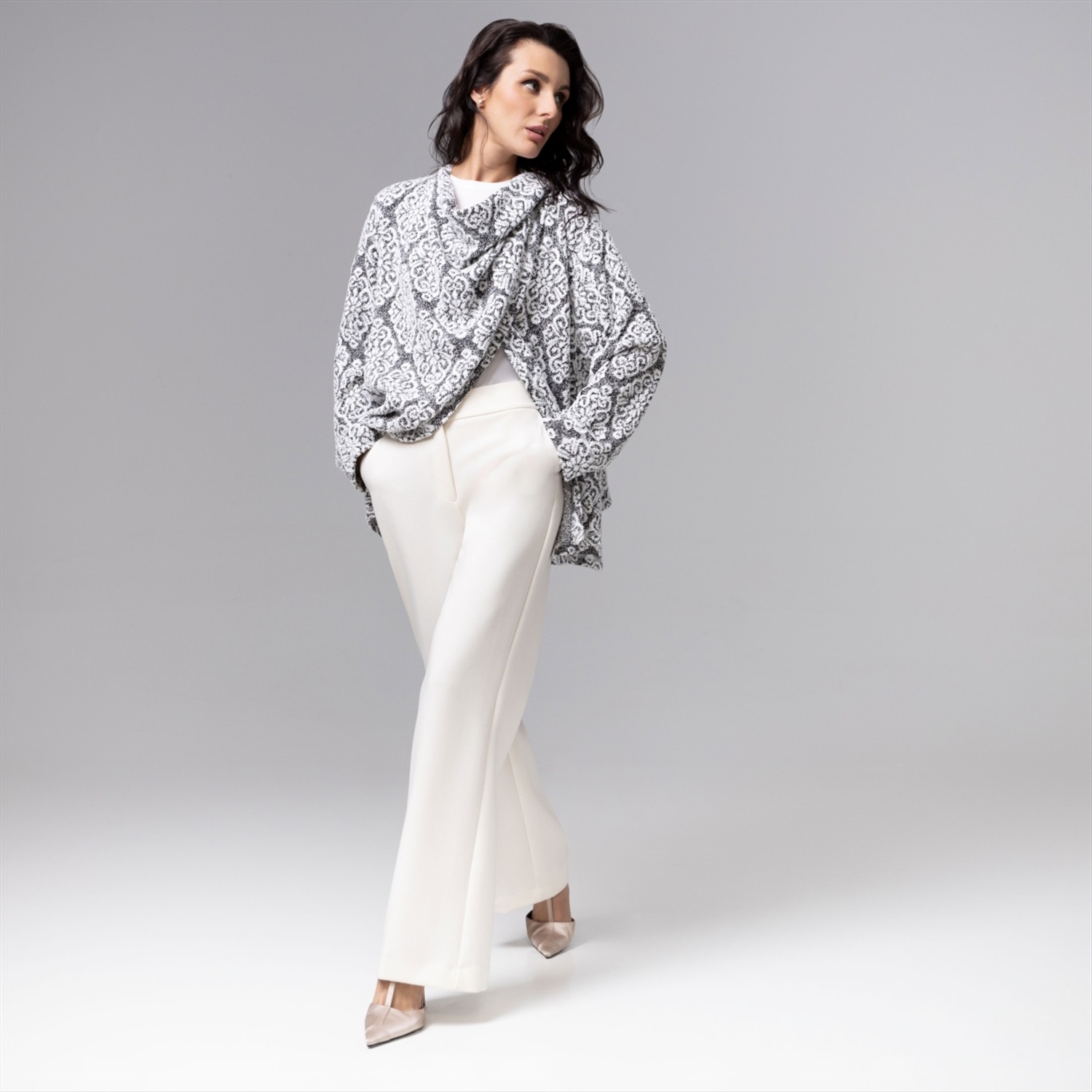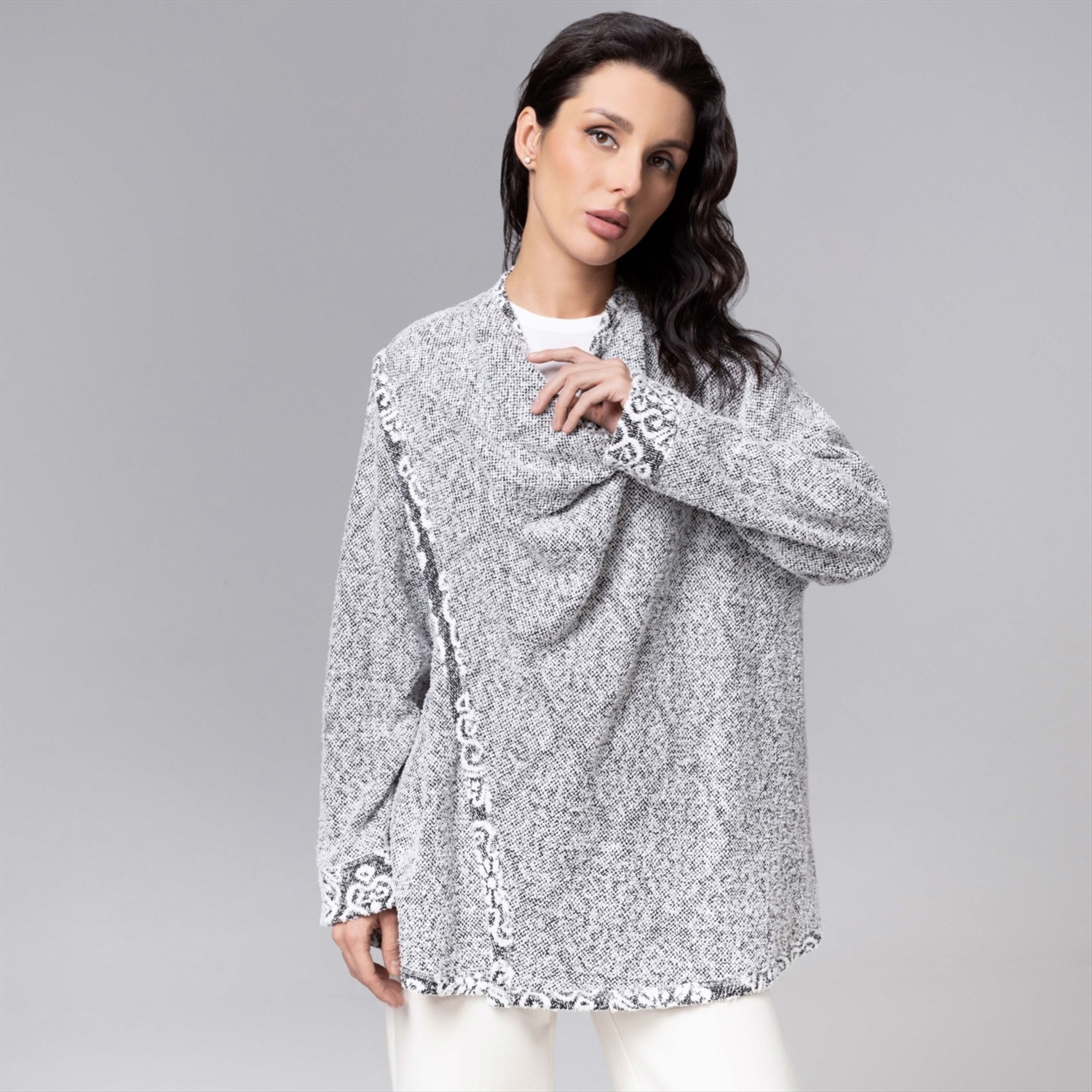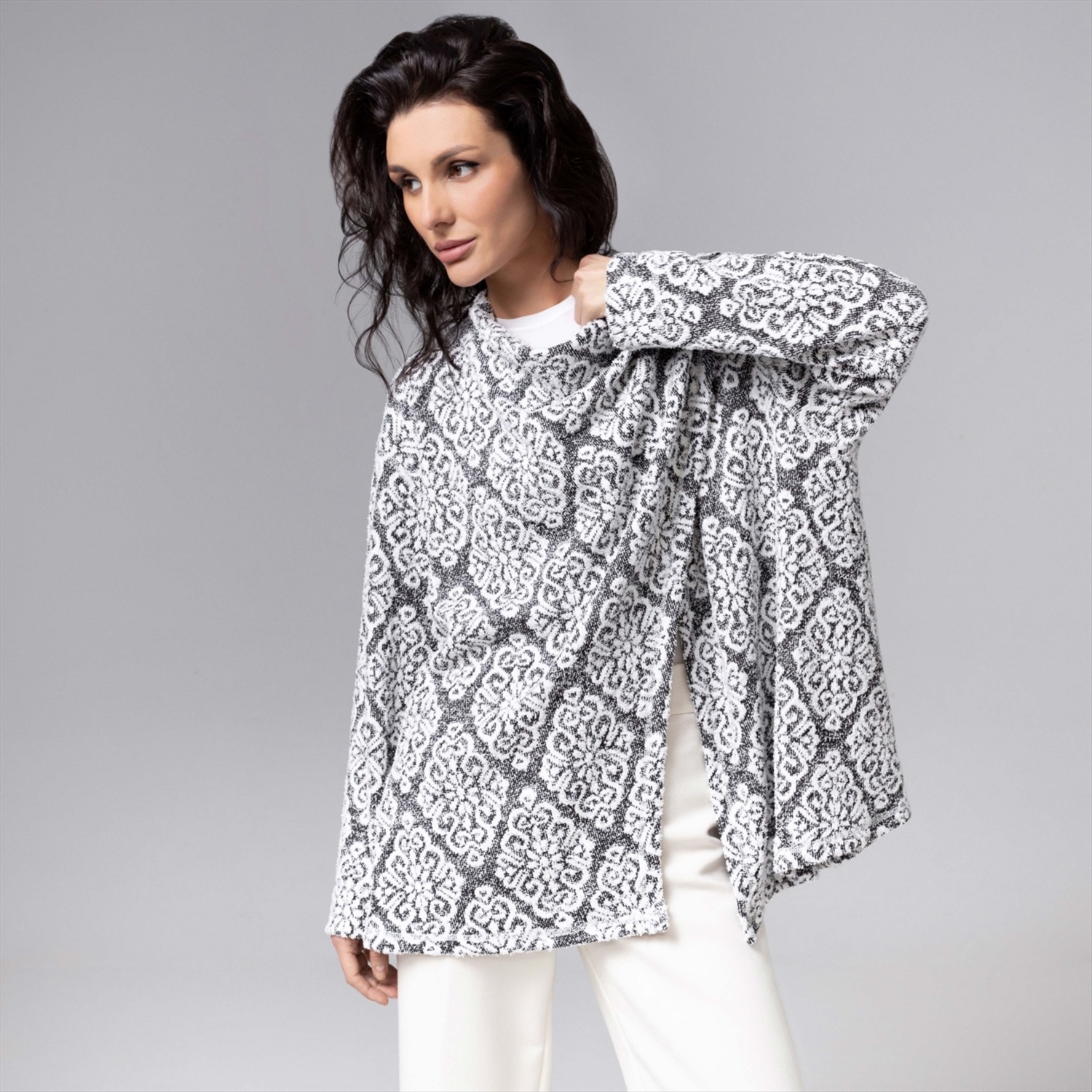 ТН ВЭД: 6110909000; Состав: Трикотаж «жаккард» (50% вискоза, 50% полиэстер); Плотность ткани: Плотная; Тип ткани: Трикотаж; Вид застежки: Нет; Декоративные элементы: Другое; Дополнительный цвет ткани: Белый; Карманы: Нет; Основной цвет ткани: Серый; Отрезная талия: Нет; Подклад: Нет; Резинка по талии: Нет; Рисунок/раппорт: Нет, все изделия идентичны; Сезон: Круглогодичный; Силуэт: Свободный; Стиль: Повседневный