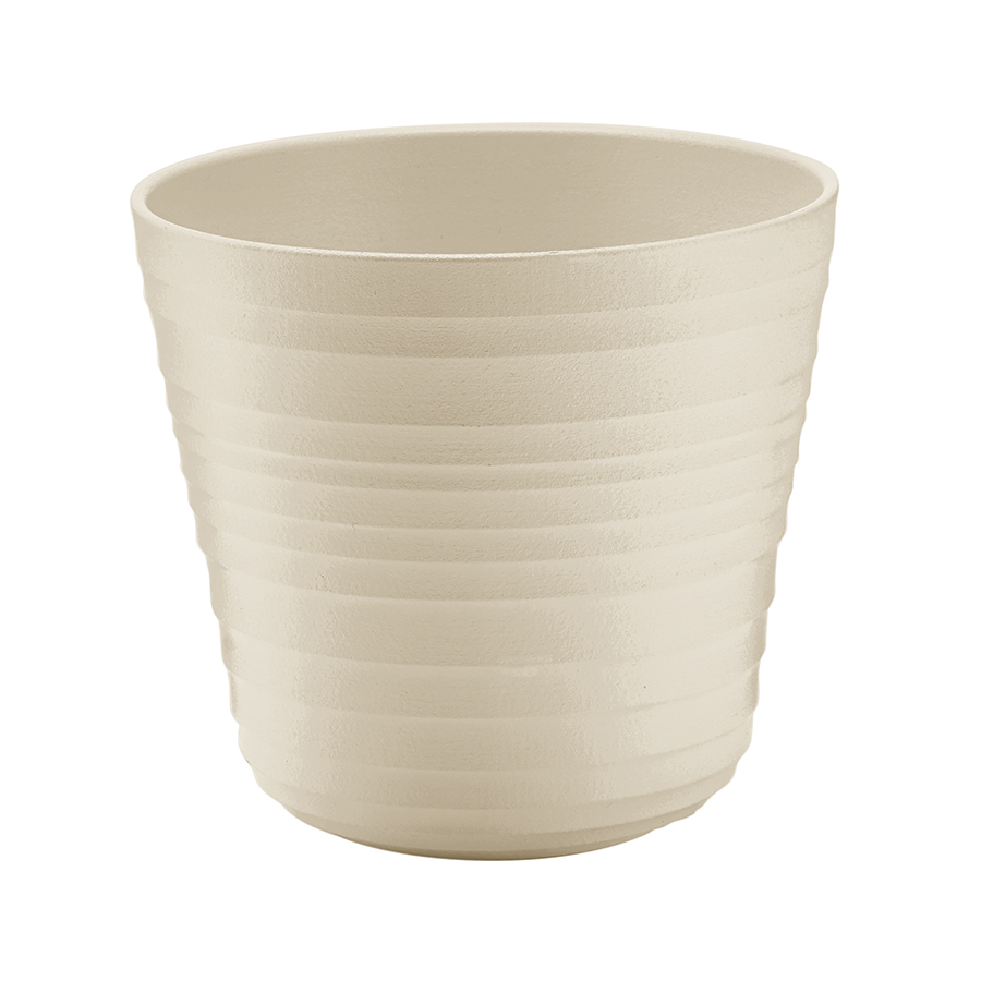 Кашпо для комнатных растений выполнено из переработанного пластика. Дизайн изделия напоминает керамику, а реалистичности внешнему виду придают тщательно подобранные пастельные тона и неровные круговые узоры, создающие эффект ручной работы.