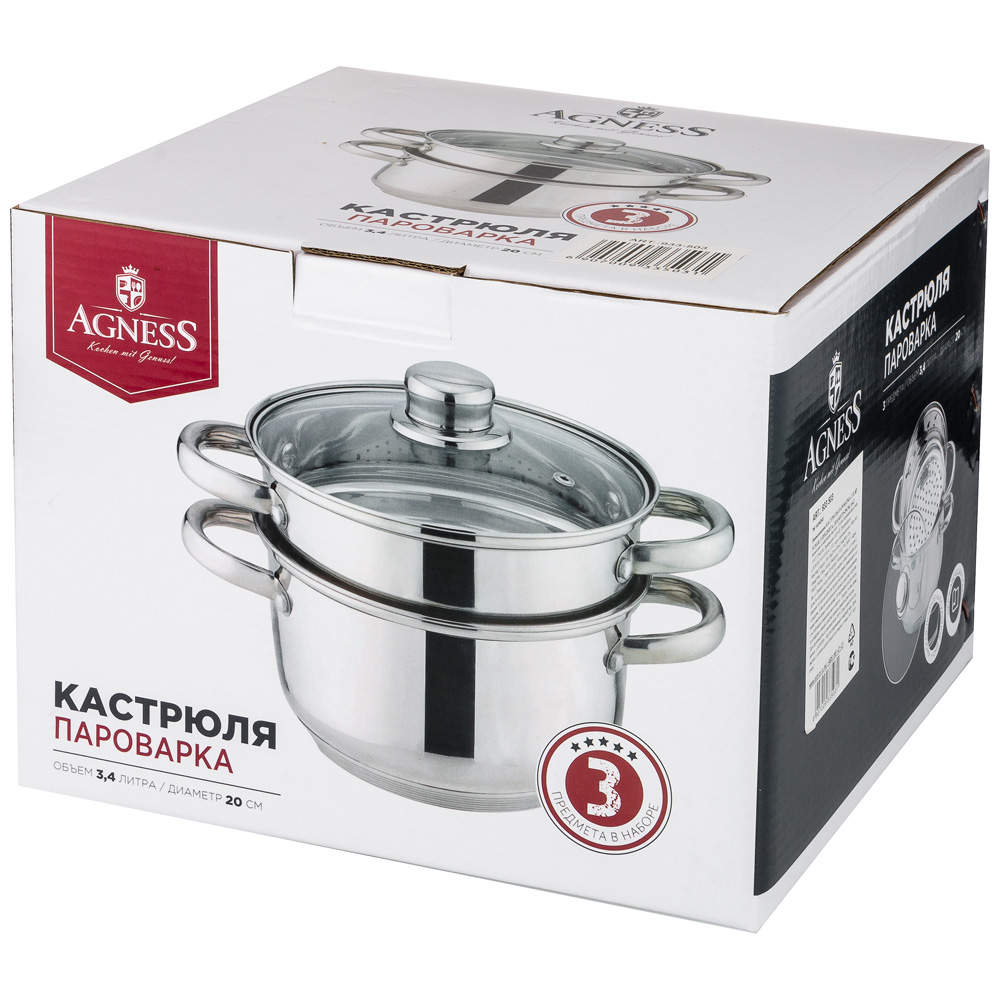 Производитель: Agness; Диаметр: 20 см; Диаметр, см: 20; Индукция: Да; Материал: Нержавеющая сталь/Стекло; Микроволновая печь: Нет; Объем: 3,4 л; Объем, л: 5; Посудомоечная машина: Да; Серия: Classic; Товарная группа: 933 группа; Бренд: Agness; Фасовка: 1/4; Страна: КИТАЙ; Маркировка: Нет; Штрих-код: 6907009335031; Вес: 1,750 кг; Количество штук в коробке: 1 - 4 шт,; Длина коробки: 25 см; Ширина коробки: 22 см; Высота коробки: 19 см
