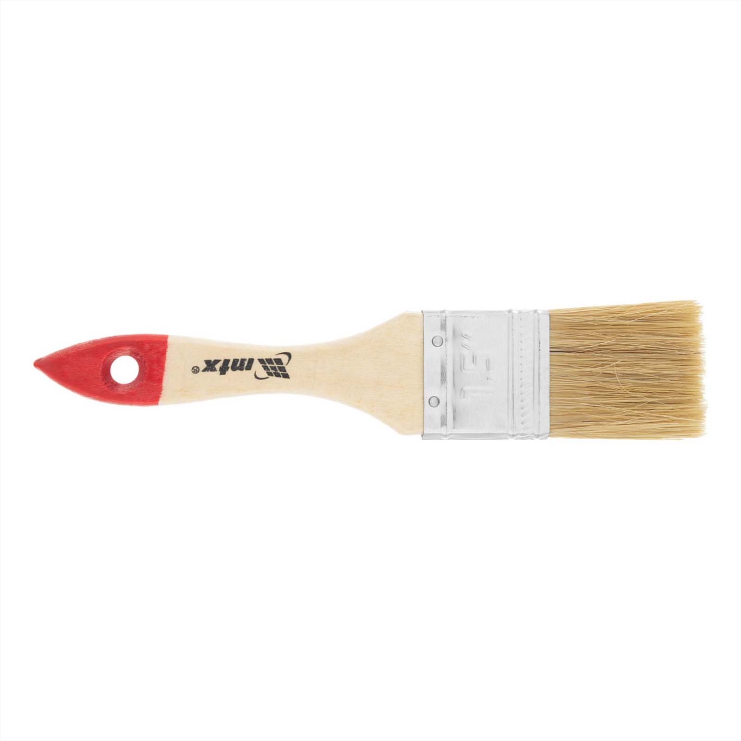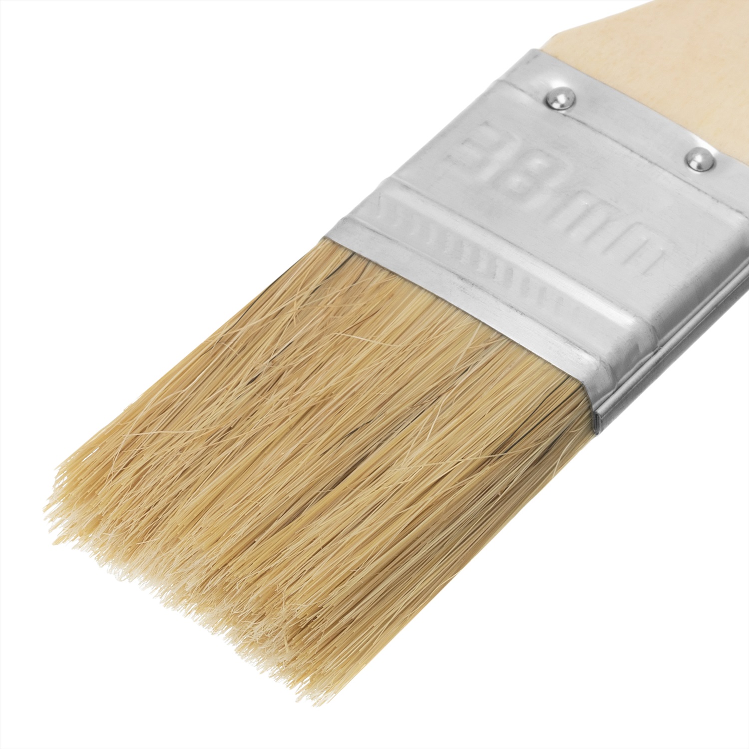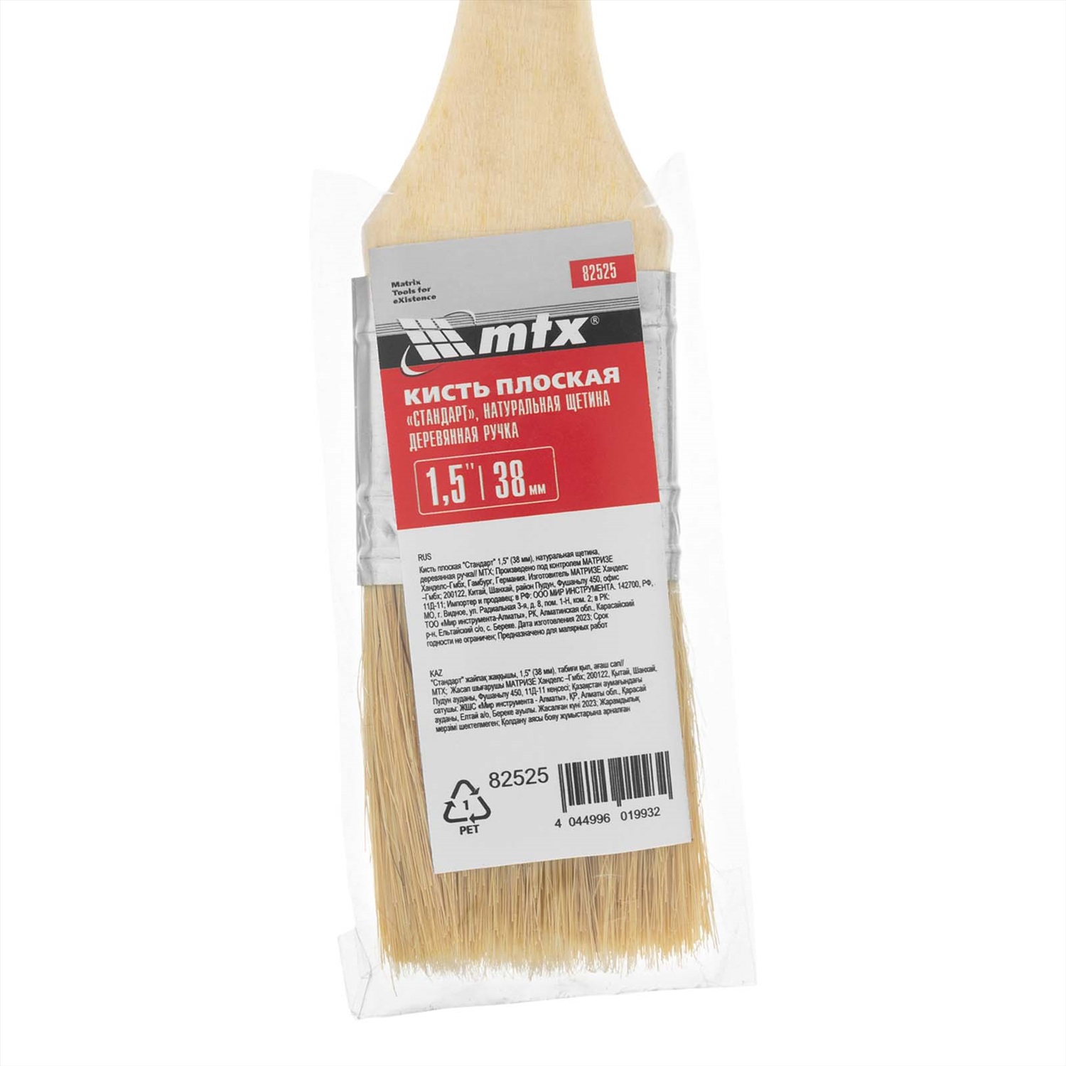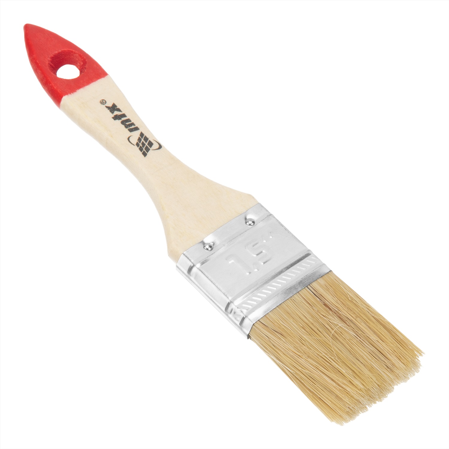 Плоская кисть MTX «Стандарт» 82525 шириной 1,5 дюйма (38 мм), с натуральной щетиной и деревянной ручкой, — инструмент для проведения бытовых малярных работ. Натуральная светлая щетина обладает высокой износоустойчивостью и подходит для нанесения красок на основе растворителей. За счет ширины 38 мм кисть подходит для окрашивания узких поверхностей, например, плинтусов и рам. Преимущества